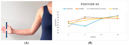 (A) Position 3 in two directions (upward and downward). (B) Plot showing elasticity across tendon regions with varying force in position 3 (upward).