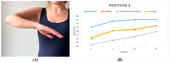 (A) Position 4. (B) Plots showing elasticity across tendon regions with varying force in position 4.
