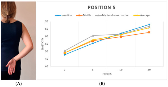 (A) Position 5. (B) Plots showing elasticity across tendon regions with varying force in position 5.