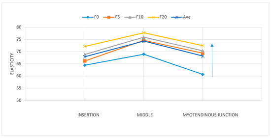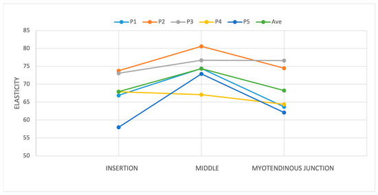 The difference in elasticity was significant between the insertion and middle sections and between the myotendinous junction and middle part, with the highest elasticity observed at the tendon’s middle point. The evaluation of individual positions showed that the difference in elasticity in different parts of the tendon was significant only in positions 1 and 5 (p < 0.05).
