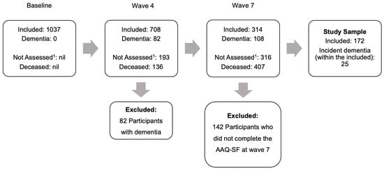 For this study, the baseline was wave 4; as this was the first wave, the performance-based IADL measure was introduced, and participants were followed over 6 years until wave 7. Wave 4 included 708 participants. Participants with a previous or new diagnosis of dementia by wave 4 were excluded (n = 82). Further, participants were only included in the present study if they remained in the study at wave 7 and had complete ATA data. Thus, for the present study, 172 participants with complete wave 7 ATA data were included. Of these, the majority had a study informant at wave 4 (n = 149, 86.6%). Participants’ mean age was 81.2 years (SD = 3.6), 60.5% were women (n = 104), 98.8% were Caucasian (n = 170), and the mean years of education was 12.5 (SD = 3.4). Figure 1 presents a flowchart of the sample selection process for this study.