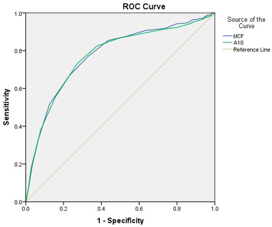 Figure 2 shows the ROC curve for the association of hypofibrinogenemia with FIBTEM-MCF, using a cutoff value of 9.5 (AUC = 0.776; 95% CI = 0.735–0.818, p = 0.001; sensitivity = 77.2%; specificity = 66.7%), and FIBTEM-A10, with a cutoff value of 8.5 (AUC = 0.772; 95% CI = 0.730–0.815, p = 0.001; sensitivity = 73.1%; specificity = 72.8%).