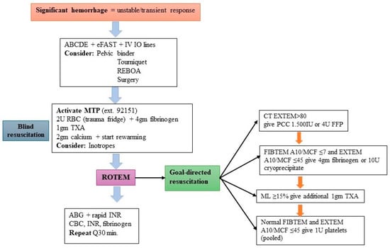 - Campbell, D.; Wake, E.; Walters, K.; Ho, D.; Keijzers, G.; Wullschleger, M.; Winearls, J. Implementation of point-of-care ROTEM® into a trauma major hemorrhage protocol: A before and after study. Emerg. Med. Australas. 2021, 33, 457–464. [Google Scholar] [CrossRef] [PubMed]