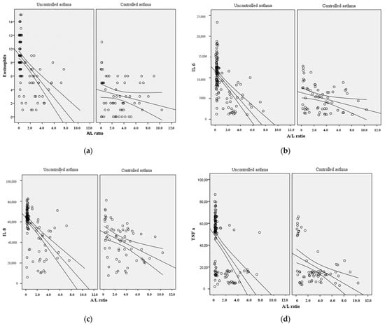 The studied parameters were further evaluated depending on the degree of asthma control. It was found that an increase in the number of eosinophils in the peripheral blood should be expected when the A/L ratio decreases (Figure 1a). In the obtained model of patients with uncontrolled/severe asthma, the coefficient of determination R2 Nagelkerke was 0.273; i.e., the model explains 27.3% of the variance of the studied ratio, which corresponds to an appreciable closeness of relationship (r = 0.546). Among patients with controlled asthma, the R2 Nagelkerke coefficient was 0.045; i.e., the A/L ratio explained 4.5% of the variability in eosinophil levels, having a weak linear relationship (r = 0.213).