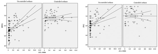 The dependence of the A/L ratio on some parameters of external respiratory function was also evaluated (Figure 2). Thus, it was found that an increase in respiratory volumes is also observed with increasing A/L ratio. It was shown that among patients with uncontrolled or severe asthma, the coefficient of determination (R2 Nagelkerke) for FEV1 was 0.173, and for FVC 0.133, thus showing that the obtained model with IR estimation by A/L ratio explains 17.3% and 13.3% of the variability of FEV1 and FVC, respectively. The obtained models had a weak linear relationship (r = 0.416 r = 0.364 for FEV1 and FVC). At the same time, among patients with controlled asthma, no correlation between the A/L ratio and external respiration parameters was found. Thus, the coefficient of determination was 0 and 0.003 for FEV1 and FVC, respectively.