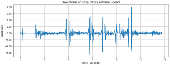 In this study, we have adopted waveform processing as a fundamental analysis tool for audio files. In particular, waveform analysis provides details of the visual representation of the audio signal’s amplitude over the passage of time. It may also help in identifying the loudness, the duration of the sound segments, and the presence of silence and/or noise. This is particularly useful in understanding the dynamics of the audio, such as the variations in sound intensity and temporal patterns, which can represent specific disease features for different asthma patients [13].