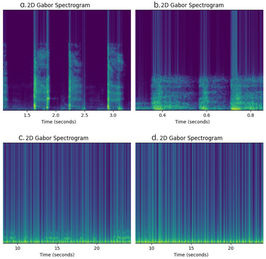 Gabor transform of the cough and respiratory signals, representing the spectra of ((a): Top Left) asthma cough audio, ((b): Top Right) healthy cough audio, ((c): Bottom Left), asthma respiratory audio, and ((d): Bottom Right) healthy respiratory audio.