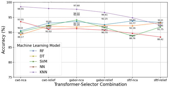It is expected that each CNN model will extract 500 features concatenated with other models, so the features may be up to 2000 in all of the net combinations. And it processes its respective time–frequency representation to extract a set of features that are particularly suited to the characteristics captured by the transformation [26], resulting in a rich, diverse feature set for subsequent analysis. There are four CNN models, resulting in a total of fifteen combinations for feature extraction. Two kinds of feature selectors are provided, so there are 450 model trials shown in Table 3 in each dataset.