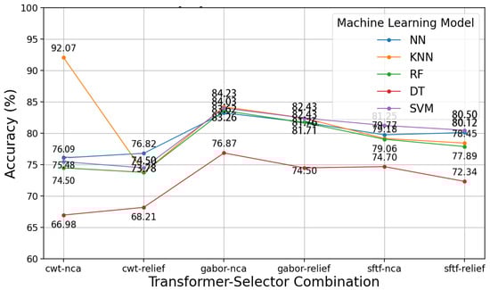 Figure 7 compares the average performance of the five proposed ML classifiers applied across these different feature extraction methods, where the values range from about 82% to 98%. It is, therefore, notable that several feature extractors seem to yield relatively high ACC across the different transformations applied. This suggests that all lightweight CNN net combinations are effective in detecting asthma. However, CWT is consistently among the highest-performing transformations across various feature extraction methods. The transformation of CWT with the NCA selector does not consistently improve the average performance of the classifiers. For some feature extraction methods, the performance with the NCA selector is slightly lower or comparable to the performance with the Relief selector. The increased performance variability seen with Gabor and Gabor-NCA transformations may be attributed to their inherent sensitivity to the specific characteristics of the input features.