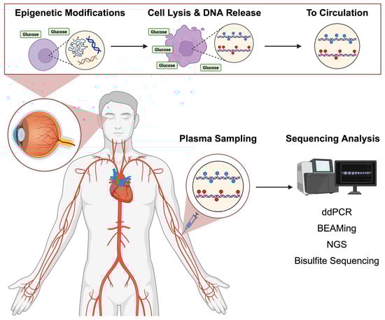 The diabetic milieu induces metabolic stress within the retinal endothelium and neuronal structures [25]. Chronic exposure to this stress leads to cell death, resulting in the release of free nuclear and mitochondrial DNA (mtDNA) into the local bloodstream, which thereafter circulates systemically [26]. Epigenetic modifications from DR in the retinal cells can be measured through pooling the circulating cell-free DNA (cfDNA) in the peripheral blood [26]. Current sequencing technologies are capable of accurately detecting pathology-signifying epigenetic features from cfDNA (Figure 1), and this technique is well-established clinically to detect genetic mutations in cancers [27,28,29,30,31].