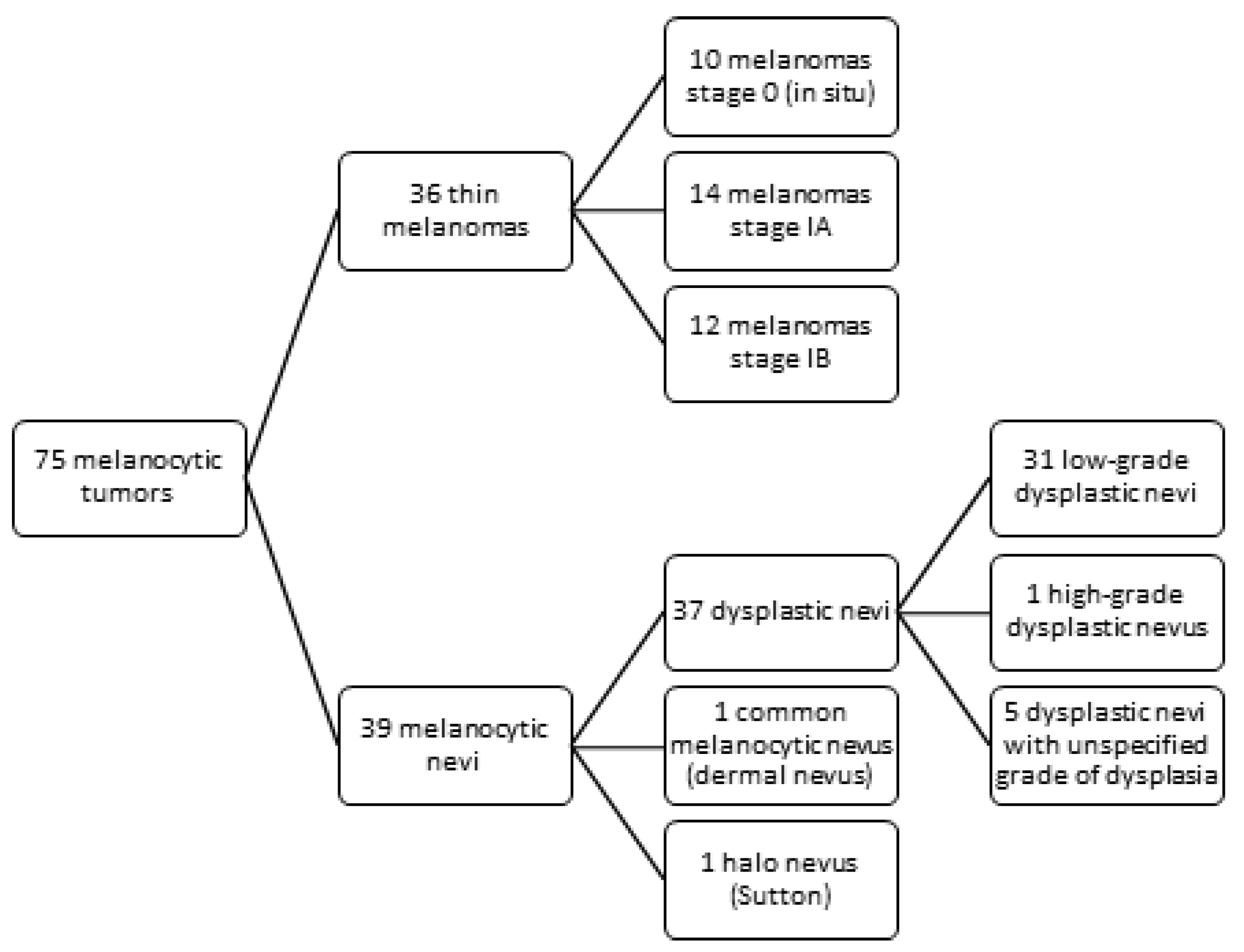 | Dysplastic nevus with an unspecified grade of dysplasia | 2 (8.7) | 3 (18.75) | ||