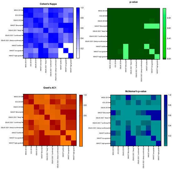 Agreement analysis between the different classification systems, with the corresponding p-values and Mc Nemar’s p-values compared in the heatmaps above. p-values and McNemar’s p-values < 0.05 were considered statistically significant.