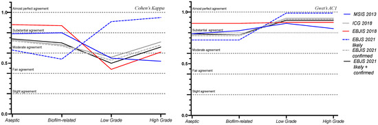 The EBJIS 2021 “likely” category apparently has limited success in recognizing the WAIOT’s biofilm-related infections (Cohen’s Kappa = 0.54, p-value < 0.01). Despite this, it must be noted that the Gwet’s AC1 test demonstrates substantial levels of agreement (Gwet’s AC1 = 0.73, McNemar’s p-value < 0.01). Thereby, the apparent discrepancy between the two agreement tests could be explained by the different prevalences of the two groups, which are better accounted for using the Gwet’s AC1 test. Furthermore, the fact that the EBJIS 2021 confirmed category displays a substantial agreement with the biofilm-related infections (Cohen’s Kappa = 0.67, p-value < 0.01, Gwet’s AC1 = 0.77, McNemar’s p-value = 0.11) may lead to the thinking that biofilm-related infections are rather included in the confirmed group, with non-invasive methods not always being effective in detecting biofilm until it reaches a more active state. Indeed, the best outcomes in identifying biofilm-related infections are yielded by the EBJIS 2018 criteria (Cohen’s Kappa = 0.87, Gwet’s AC1 = 0.89, p-value and McNemar’s p-value < 0.001). This is probably due to the incorporation in the classification system of novel techniques, including next-generation sequencing (NGS). Biofilm-related infections pose a significant challenge, requiring advanced and expensive diagnostic techniques while carrying the constant risk of overdiagnosis. Given these challenges, it appears unlikely that an effective screening method for biofilm infections can be established with current methodologies, at least not until these infections transition to a more active phase.