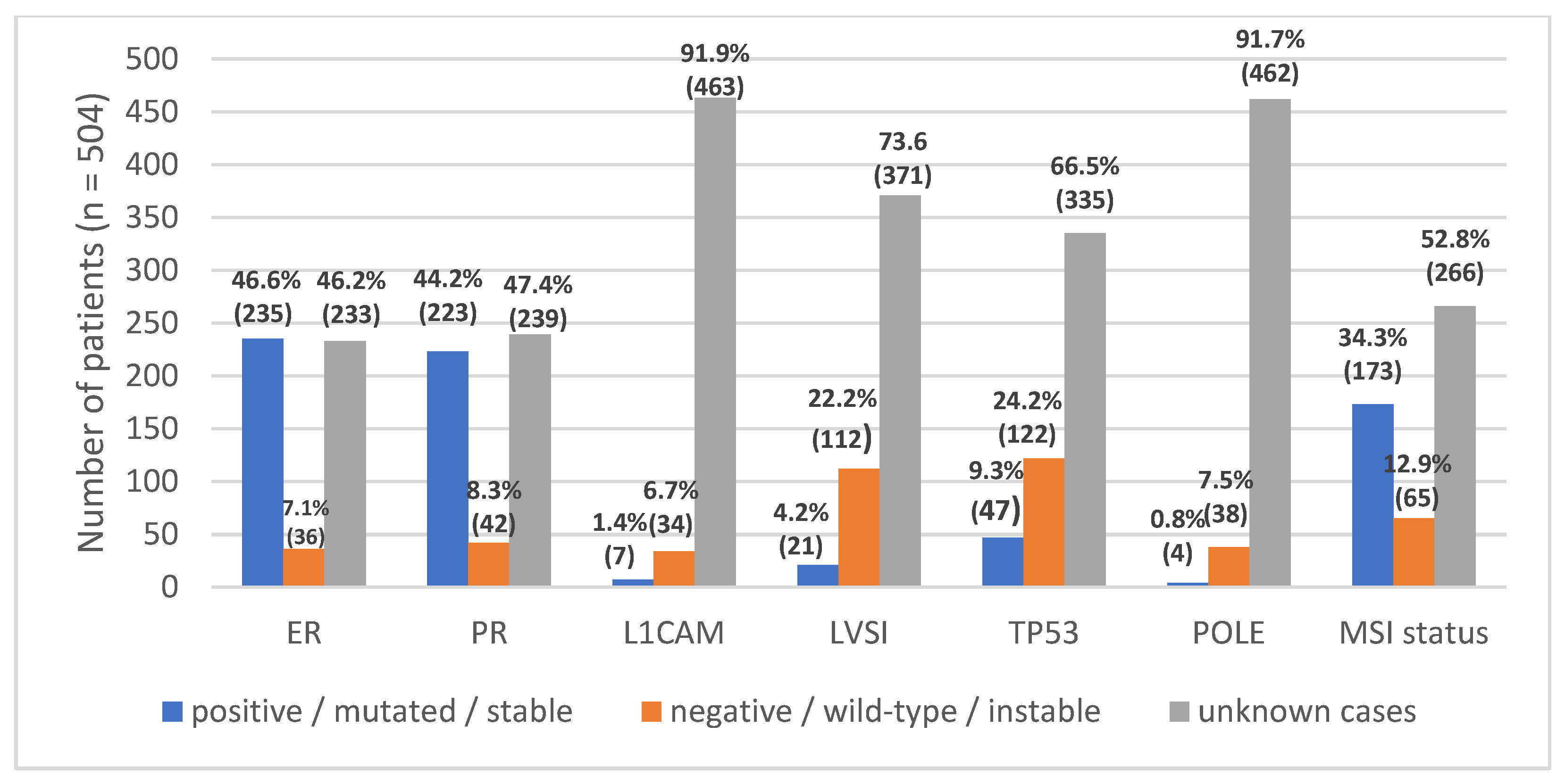 - Kelkar, S.S.; Prabhu, V.S.; Zhang, J.; Ogando, Y.M.; Roney, K.; Verma, R.P.; Miles, N.; Marth, C. Real-world prevalence of microsatellite instability testing and related status in women with advanced endometrial cancer in Europe. Arch. Gynecol. Obstet. 2024, 309, 2833–2841. [Google Scholar] [CrossRef] [PubMed]