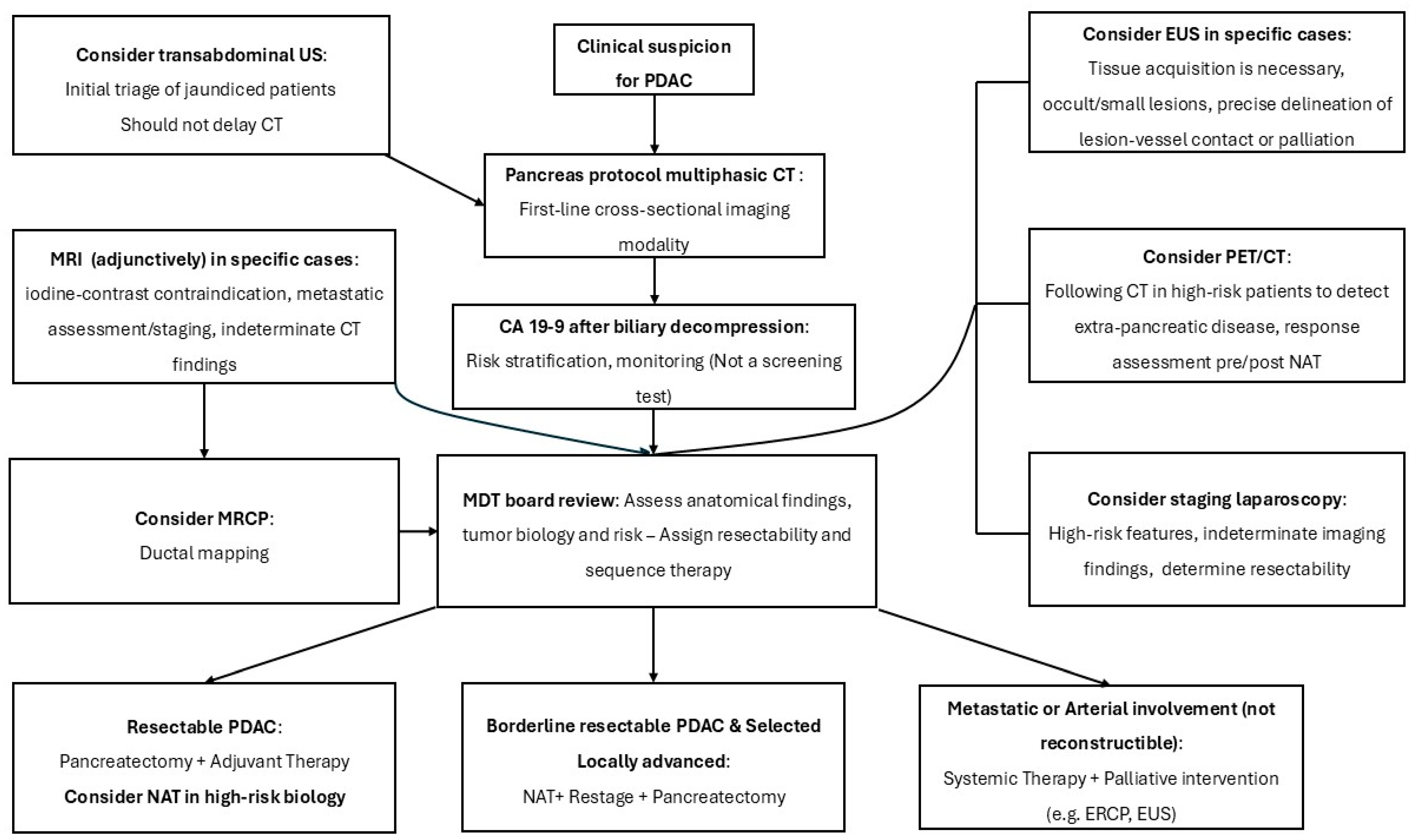 Table 1 summarizes the diagnostic modalities and their clinical indications for PDAC assessment, together with key imaging findings. Figure 1 complements this overview by outlining a practical diagnostic algorithm for PDAC.