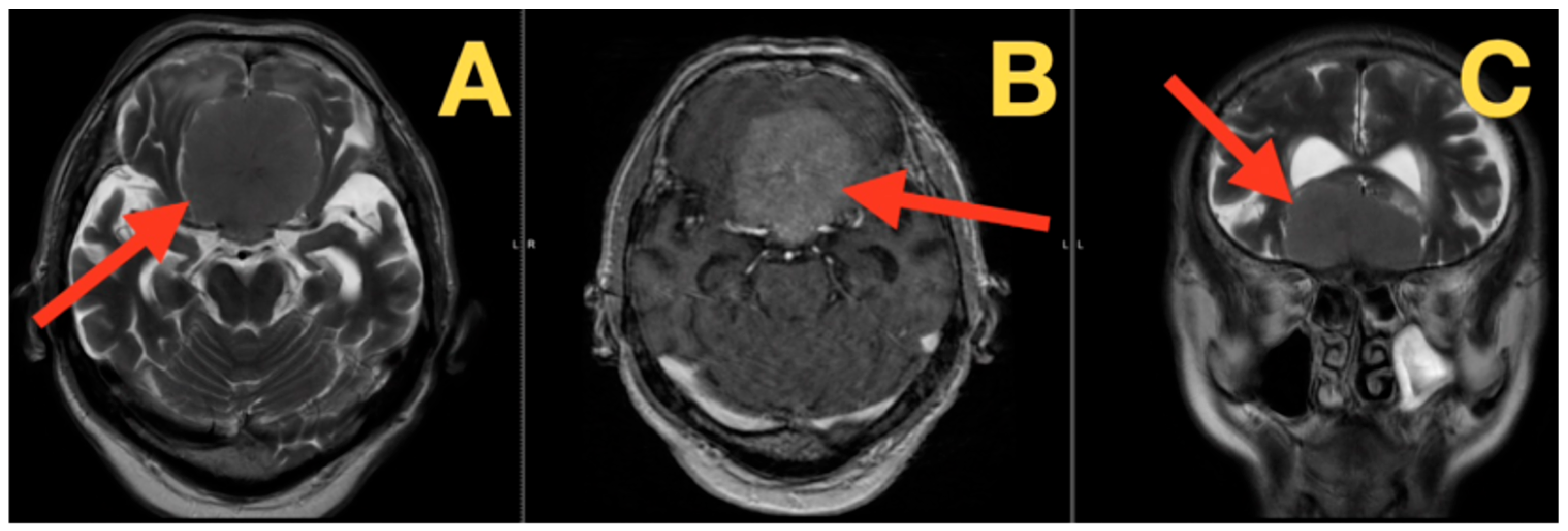 - Mastantuoni, C.; Cavallo, L.M.; Esposito, F.; d’Avella, E.; de Divitiis, O.; Somma, T.; Bocchino, A.; Fabozzi, G.L.; Cappabianca, P.; Solari, D. Midline Skull Base Meningiomas: Transcranial and Endonasal Perspectives. Cancers 2022, 14, 2878. [Google Scholar] [CrossRef]