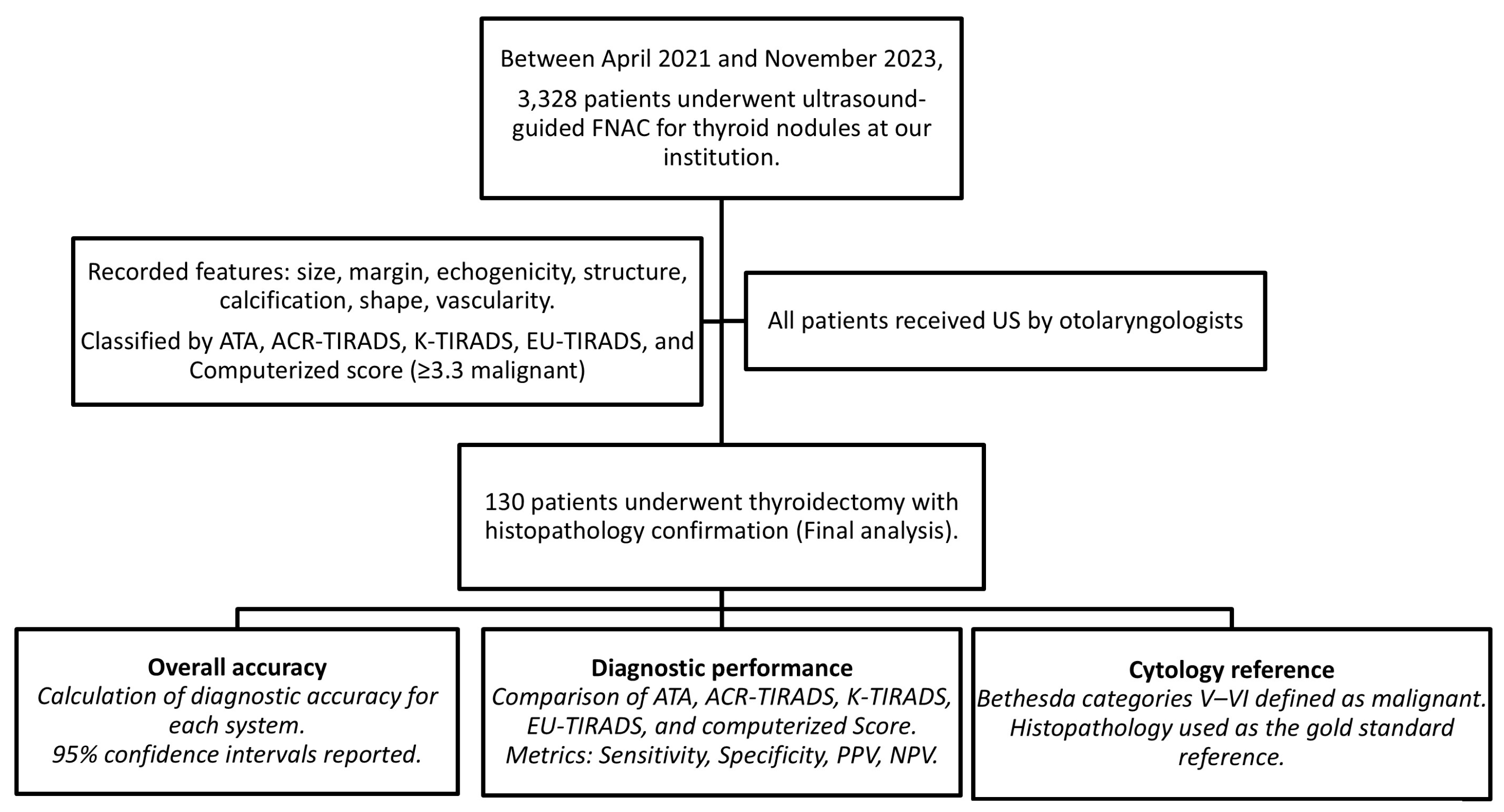 APA StyleWu, J.-Y., Cheng, P.-C., Wen, M.-H., Chang, C.-M., Lo, W.-C., Cheng, P.-W., Wu, P.-H., & Liao, L.-J. (2026). Comparative Diagnostic Performance of Ultrasound-Based Risk Stratification Systems in Thyroid Nodule Evaluations by Otolaryngologists. Diagnostics, 16(1), 128. https://doi.org/10.3390/diagnostics16010128