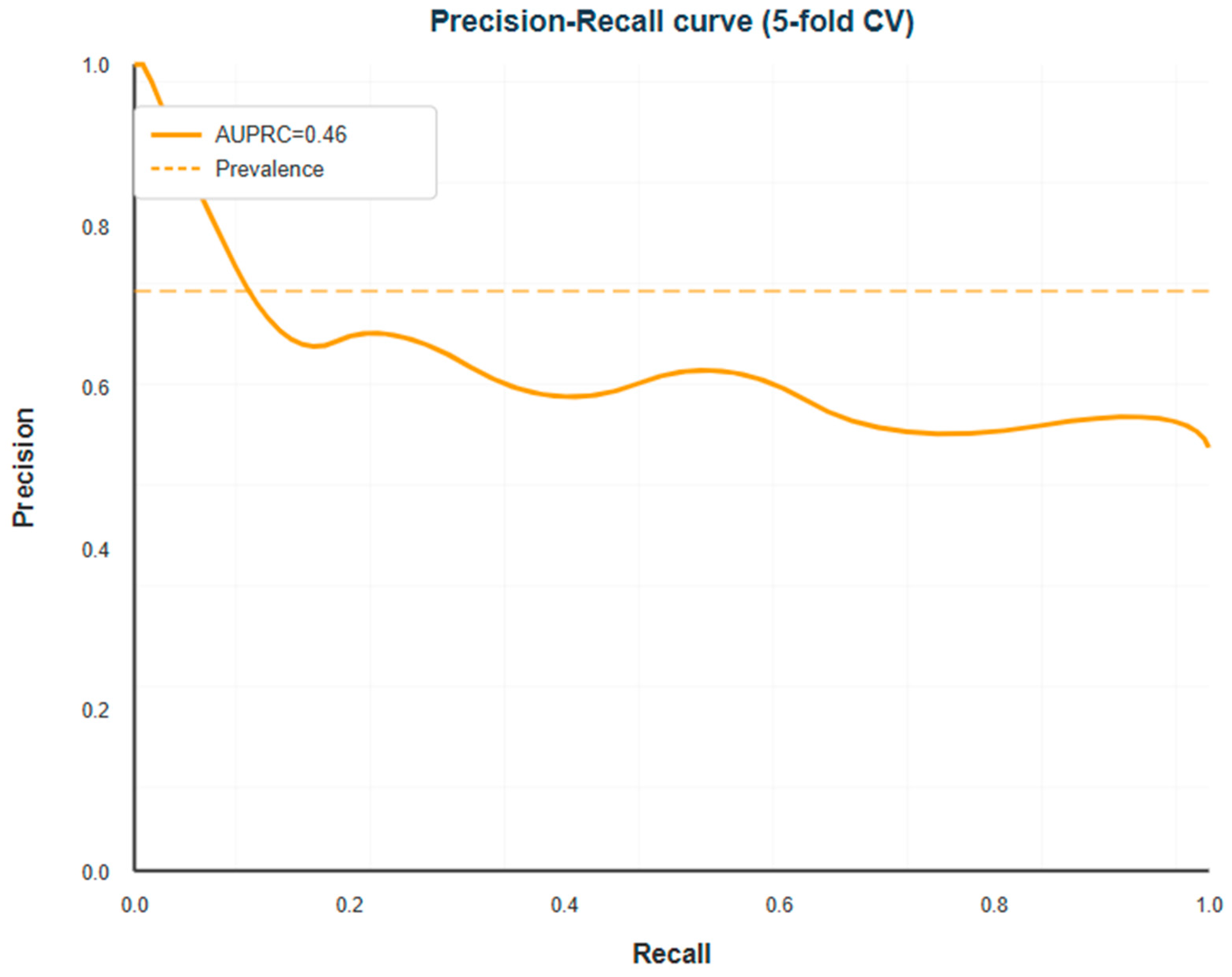 The ROC curve looked like it had a steep rise in sensitivity at low false positive rates, followed by a more gradual trade-off at higher thresholds. The precision–recall curve showed that precision stayed above 0.35 for recall values up to about 0.60. After that, precision dropped quickly, which means that trying to get very high sensitivity would mean a lot of false positive predictions. See