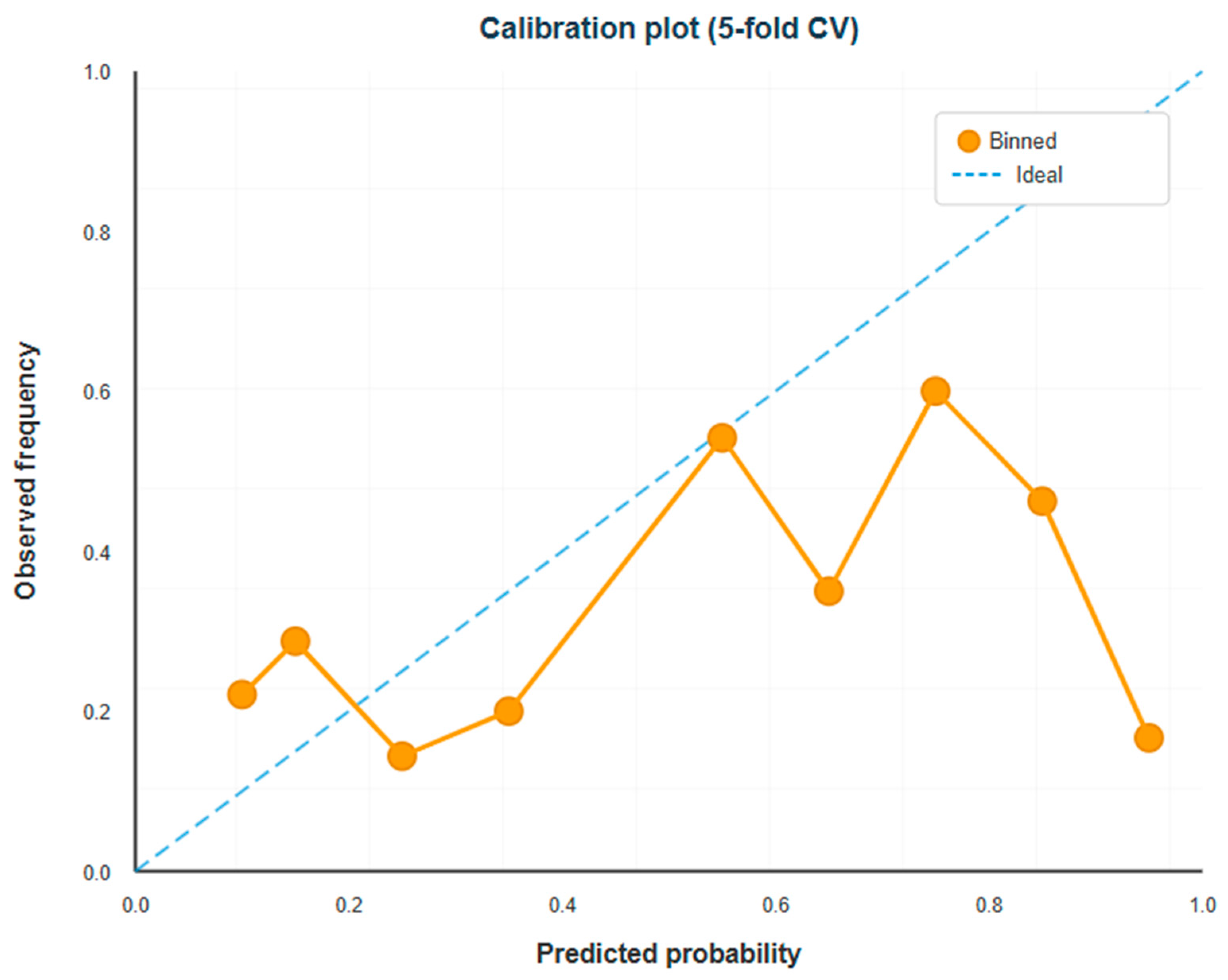 At predicted probabilities above 0.7, the model showed overestimation, though these bins contained few observations with wide confidence intervals. The isotonic-smoothed calibration curve exhibited minor S-shaped deviation from perfect calibration, consistent with models developed on limited samples.