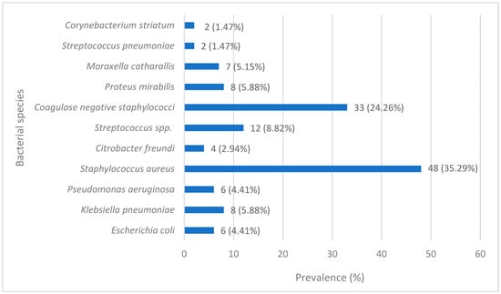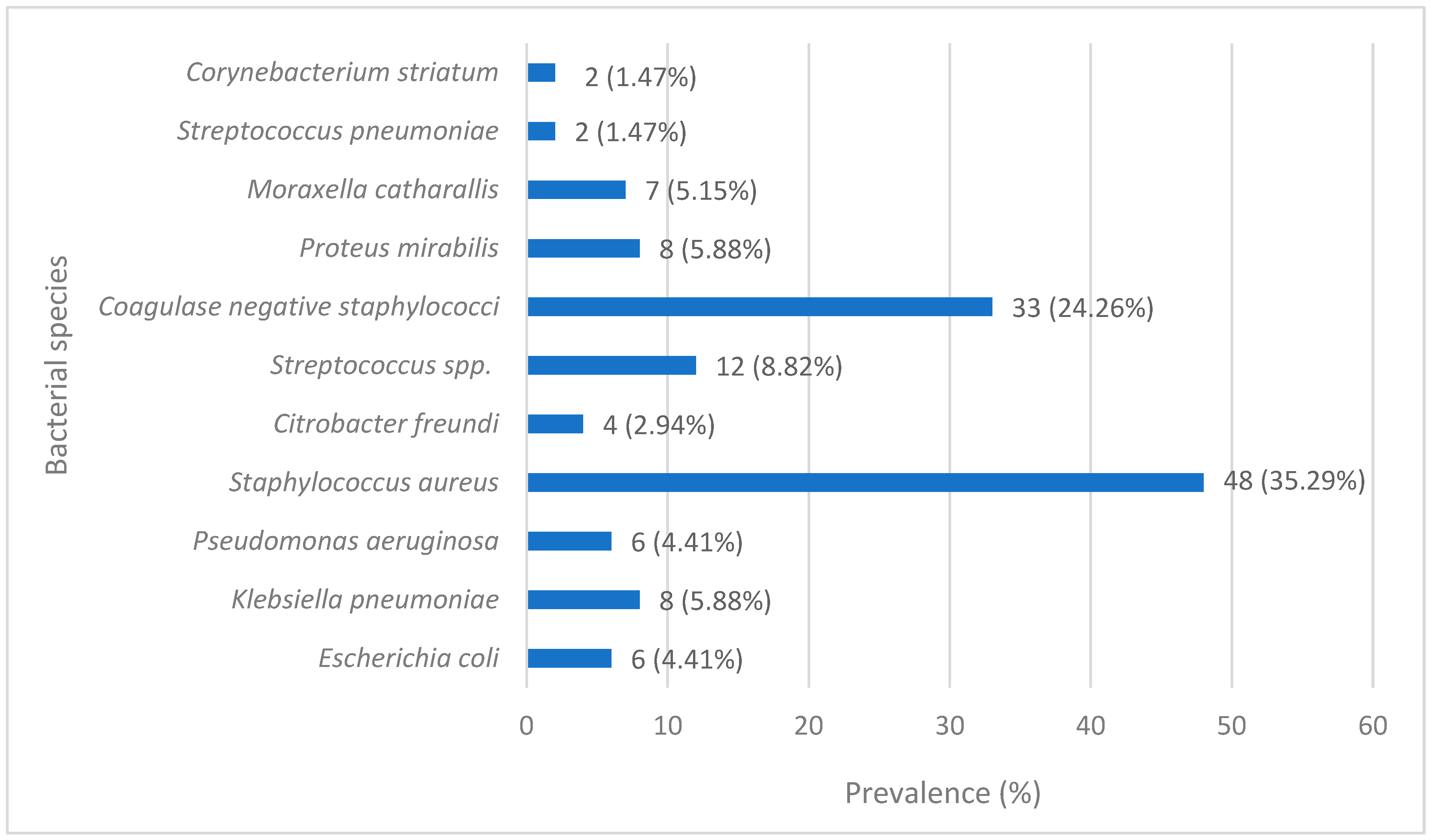 Figure 2. Percentage distribution of bacterial species isolated from corneal scrapings. The clear predominance of Gram-positive cocci, especially Staphylococcus aureus, compared to Gram-negative bacilli, is highlighted.