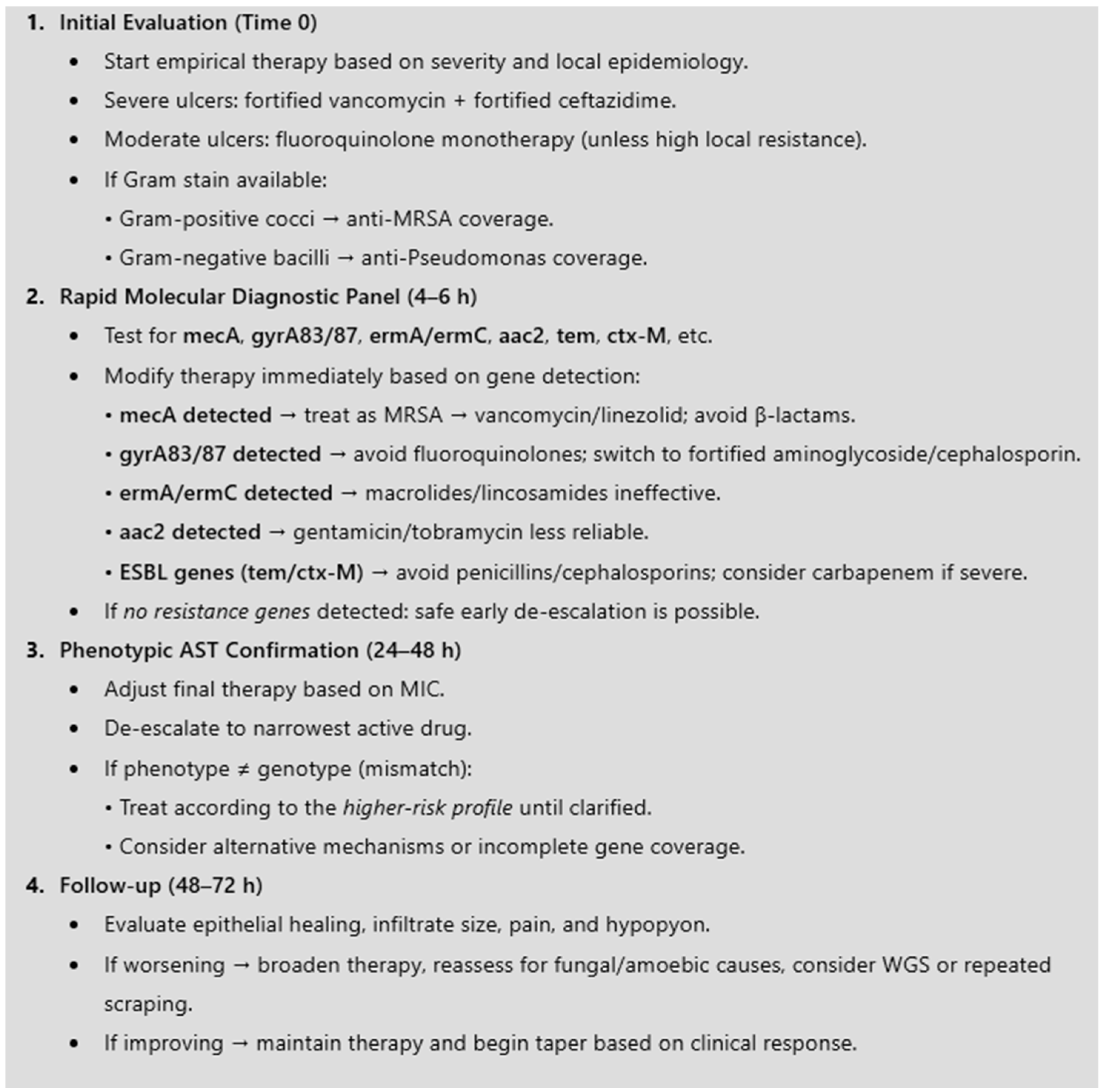 Figure 1. Evidence-based treatment algorithm for bacterial keratitis integrating rapid molecular diagnostics. AST—Antibiotic Susceptibility Testing; ESBL—Extended Spectrum Beta Lactamases; MIC—Minimum inhibitory concentration; MRSA—Methicillin-resistant Staphylococcus aureus; WGS—Whole-Genome Sequencing.
