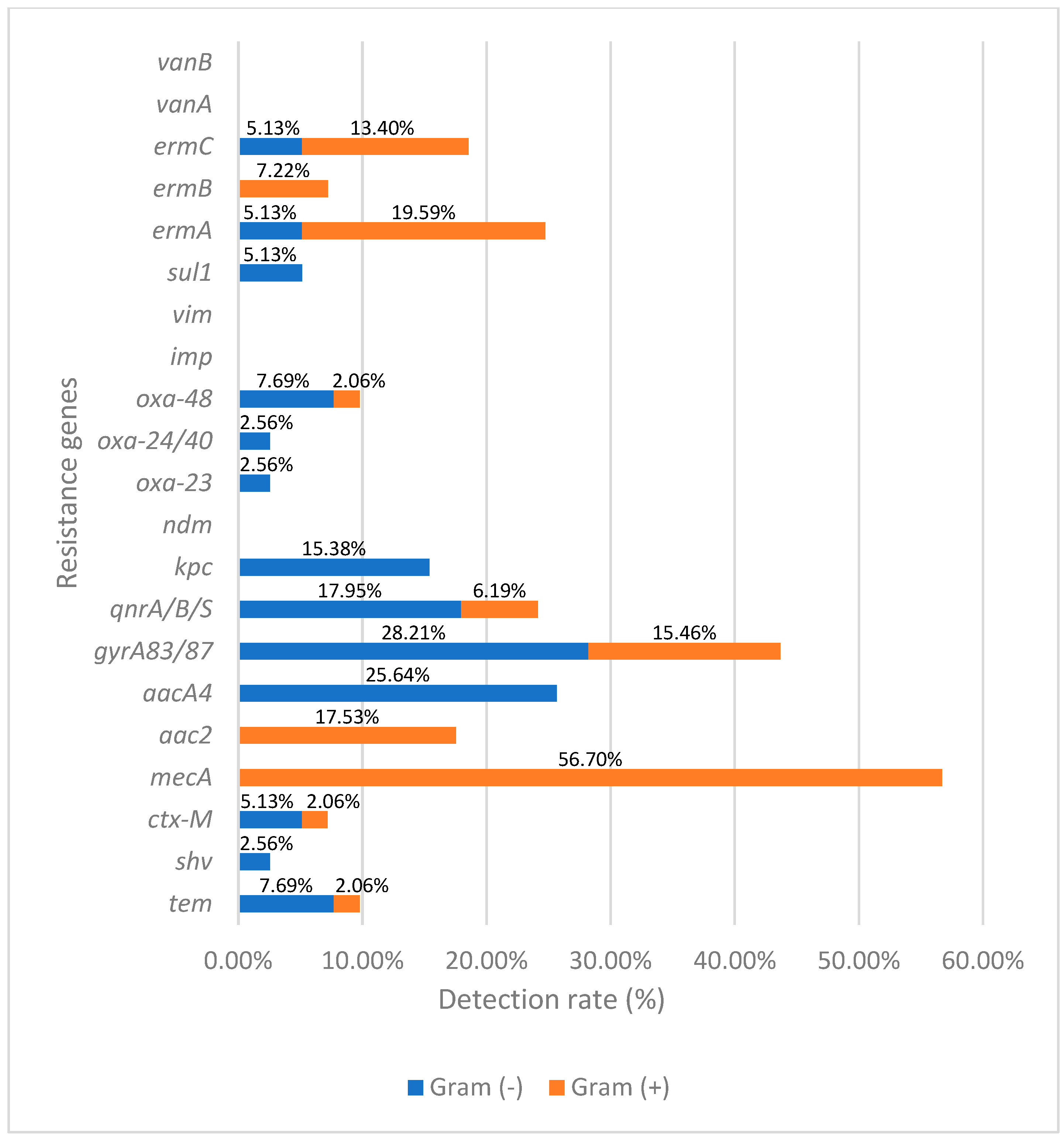 2.3. Molecular Identification of Bacteria and Resistance Genes
