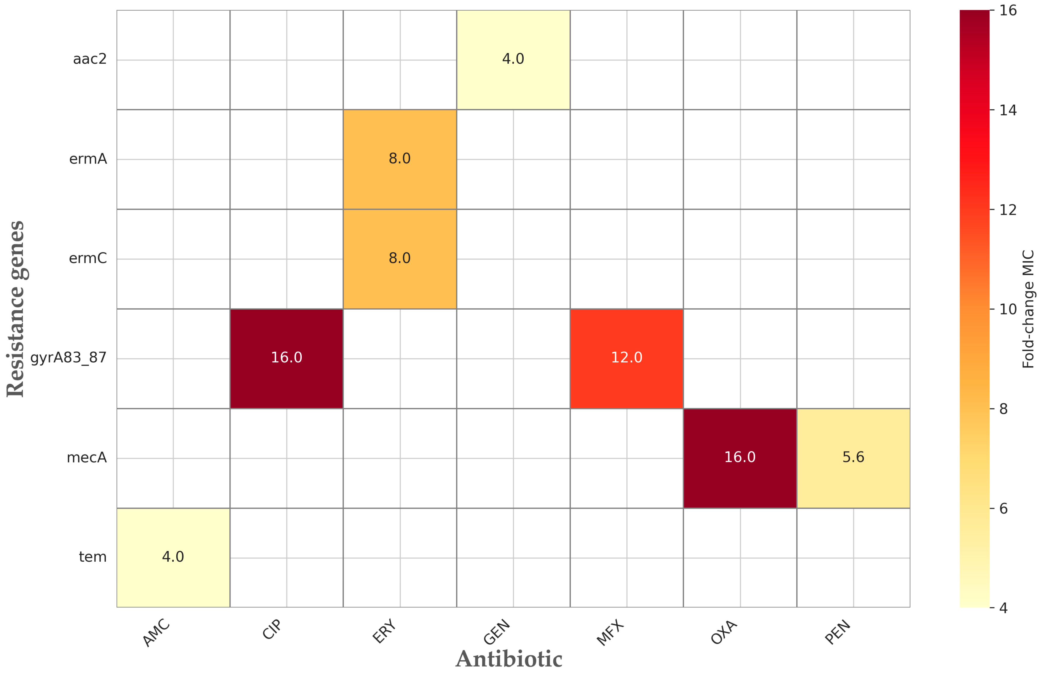 Figure 5. Significant correlations (p < 0.05) between phenotype and genotype: fold-change of MIC values.