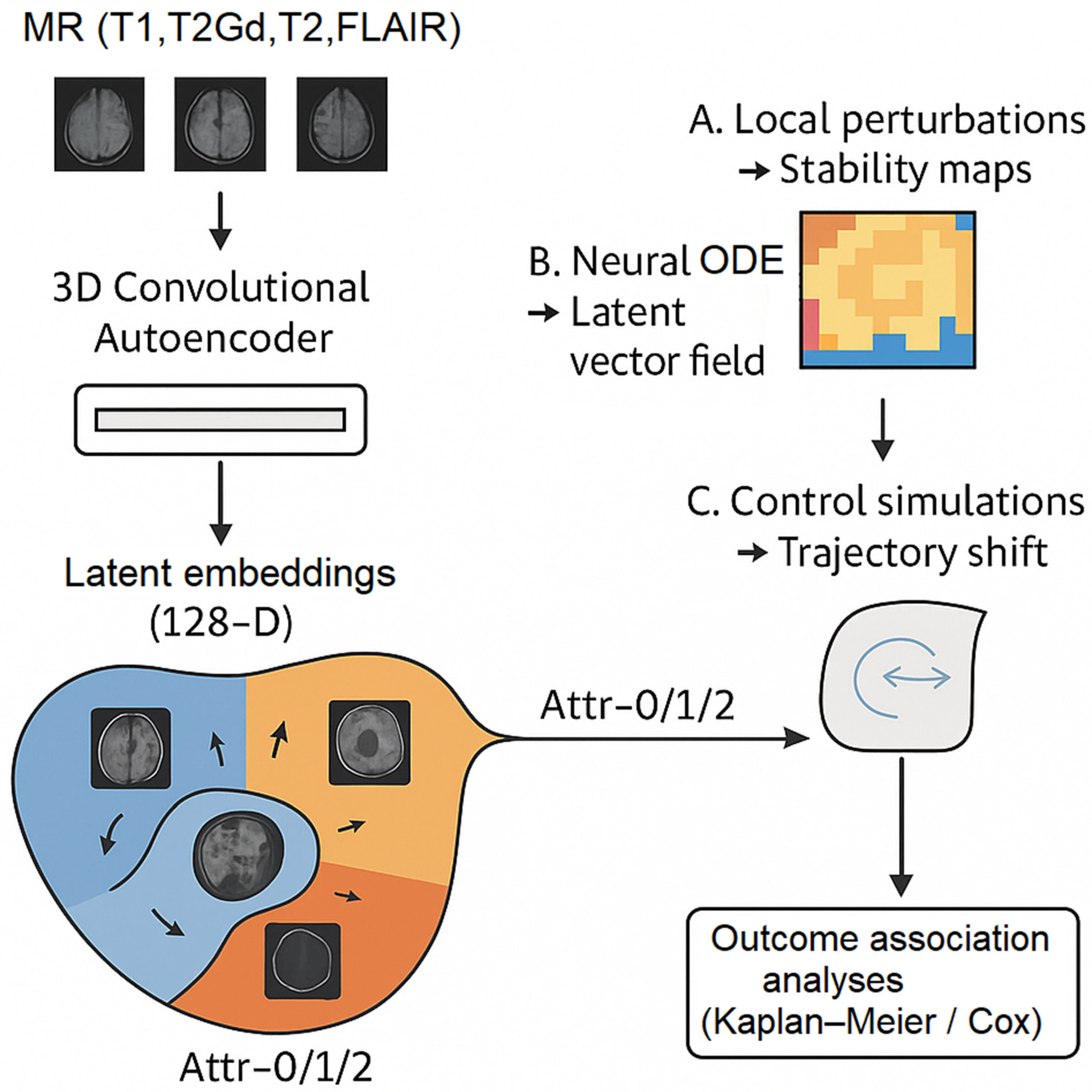 The complete computational workflow—from MRI encoding to attractor discovery, perturbation analysis, and survival association—is summarized schematically in