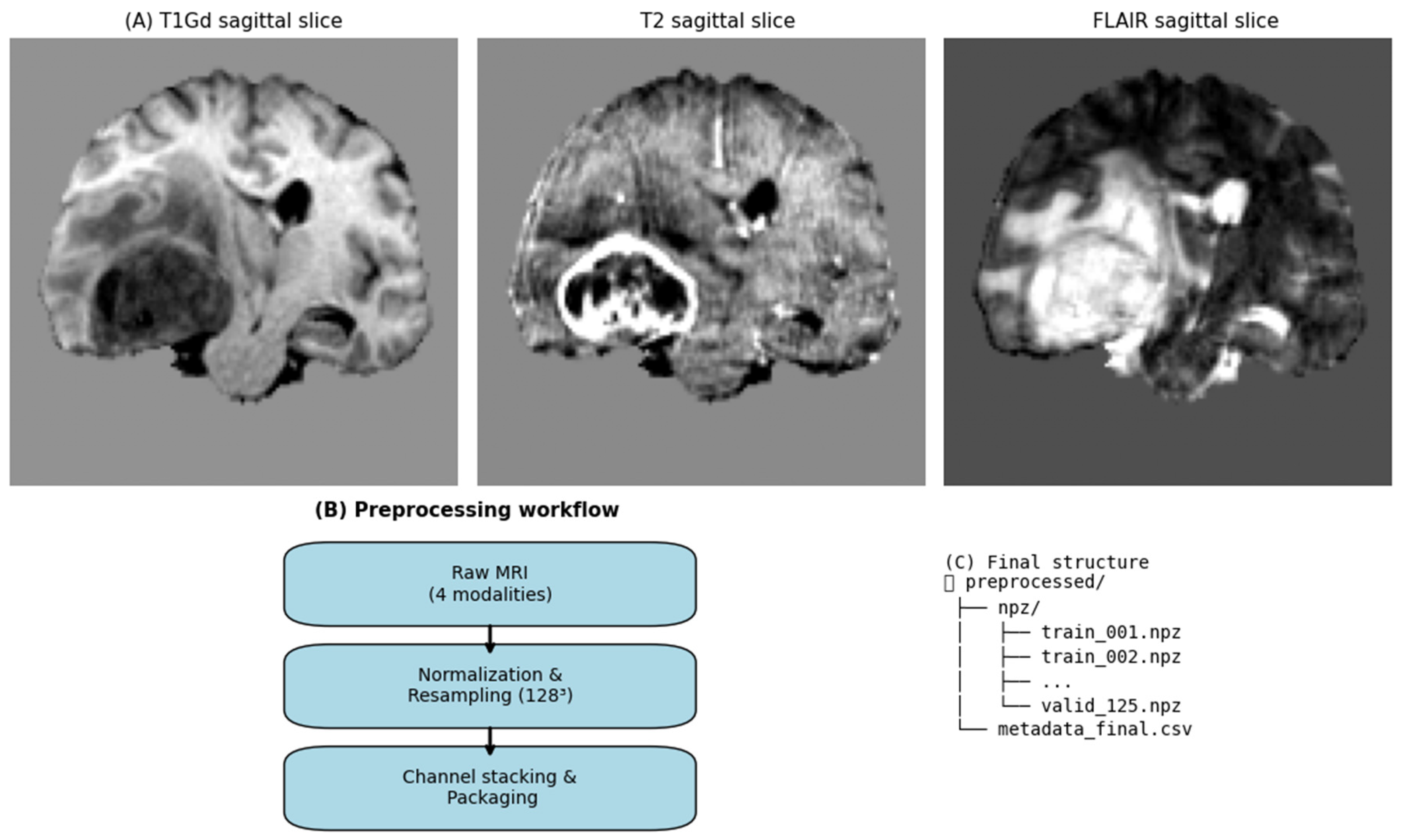 Each subject includes four co-registered MRI sequences: T1-weighted (T1), Gadolinium-enhanced T1-weighted (T1Gd), T2-weighted (T2), and fluid-attenuated inversion recovery (FLAIR).