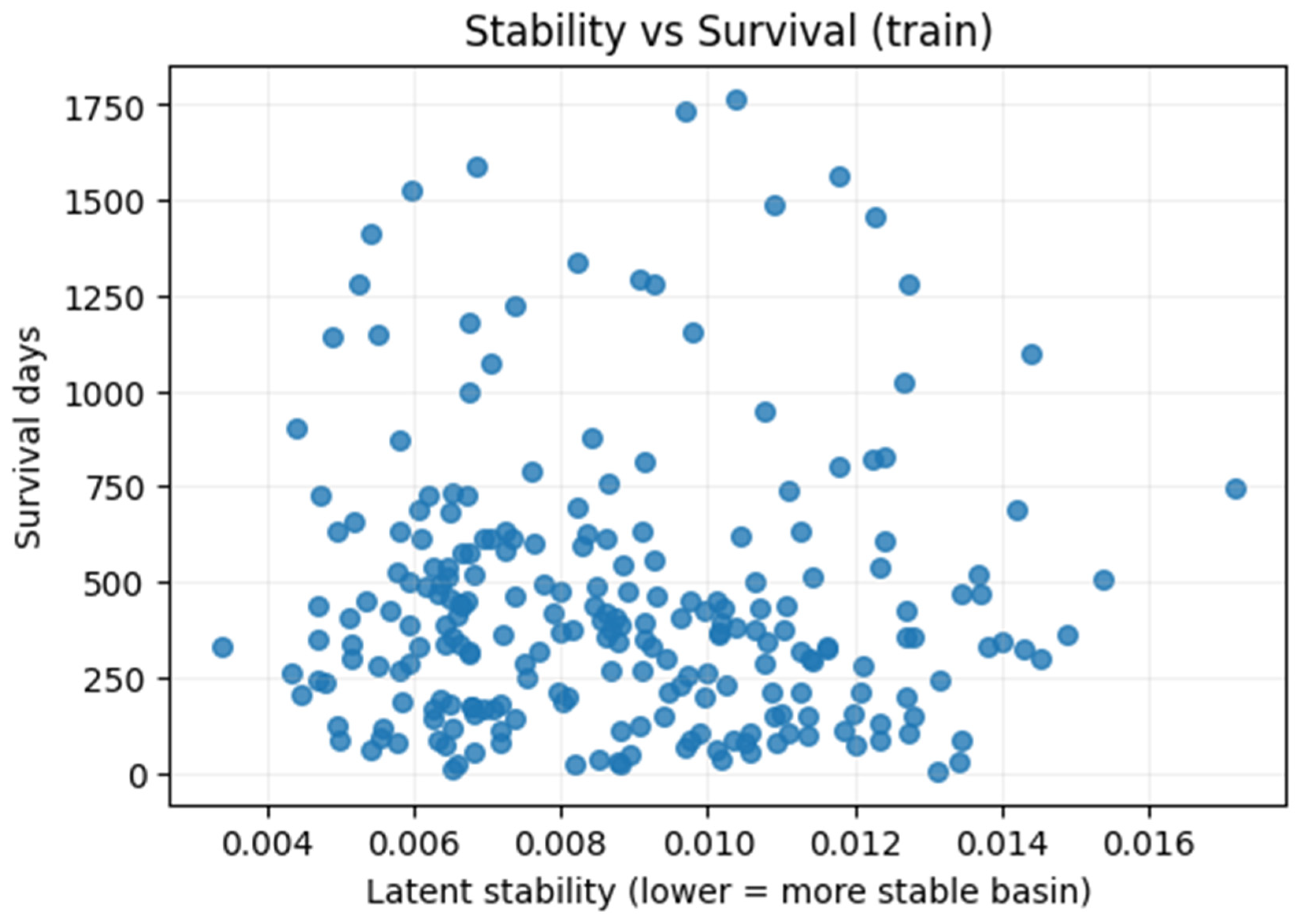 The discovery of three reproducible attractor basins—supported by statistically significant survival stratification and consistent latent stability gradients—suggests that the GBM morphology evolves through discrete, metastable regimes rather than continuous random variation. These latent attractors provide an interpretable, mechanistic abstraction of morphologic heterogeneity and outcome variability.
