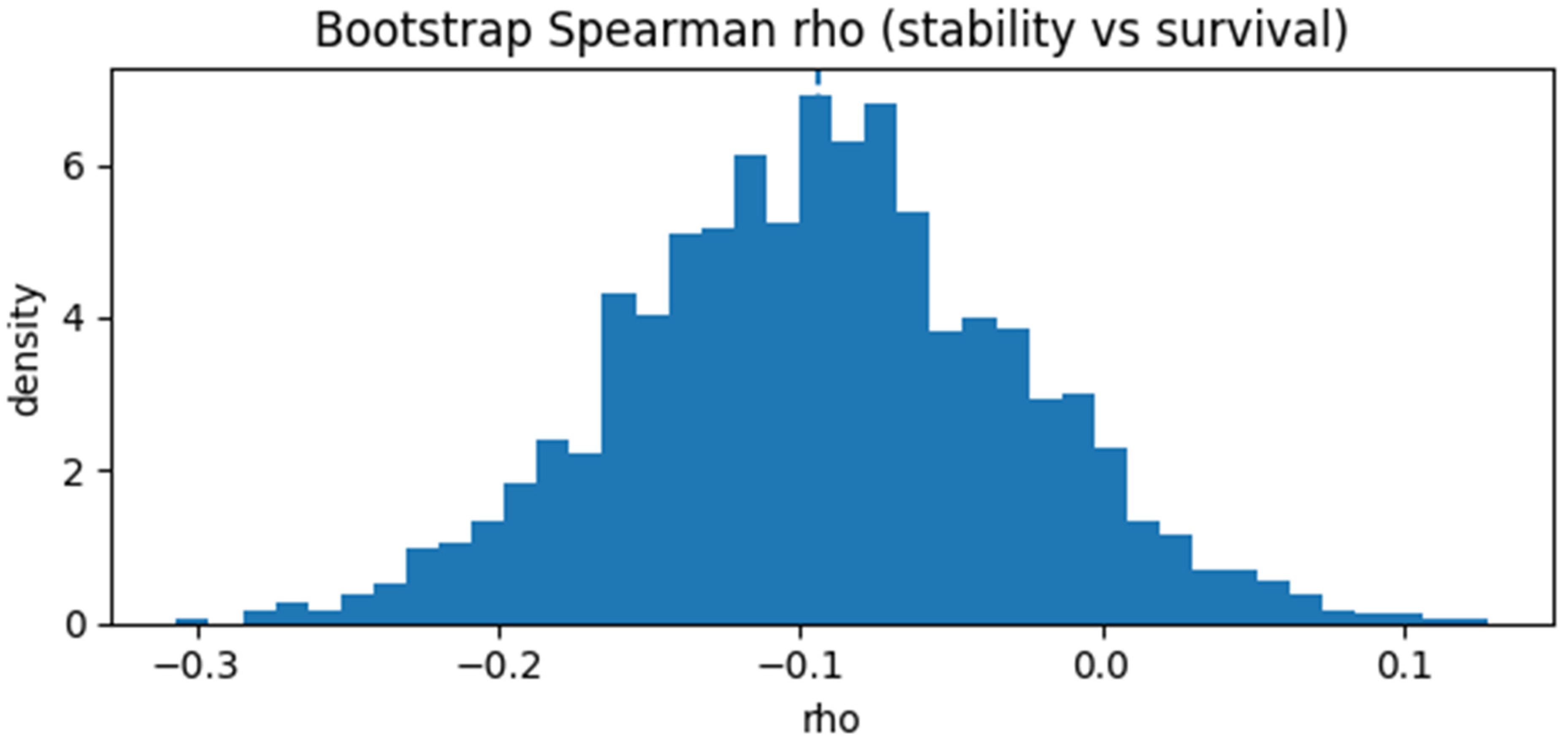 Clustering robustness. Attractor discovery was stable across K = 2–4, with survival separation persisting (Δχ2 < 10%, all p < 0.05). K-means re-initializations (10 seeds) yielded ARI > 0.99, confirming label invariance.