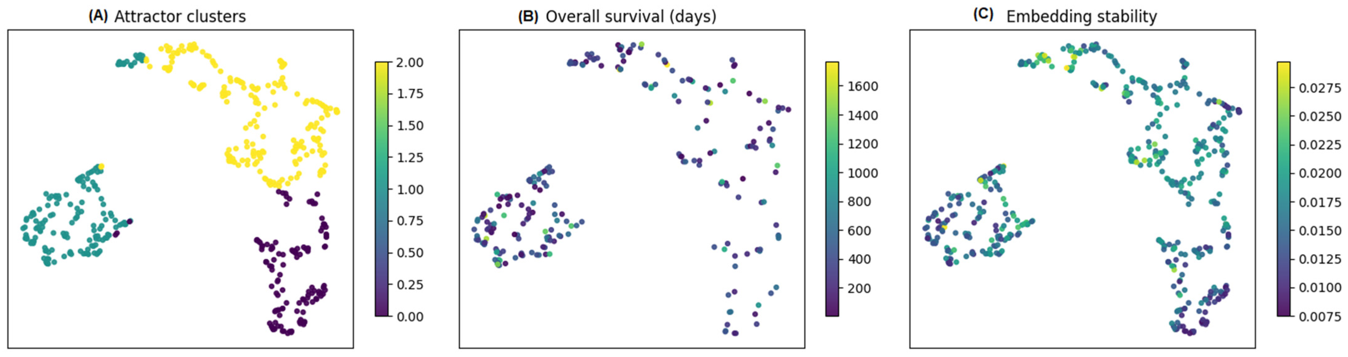 Clarification: Numeric attractor labels (Attr-0, Attr-1, Attr-2) are arbitrary algorithmic identifiers and have no intrinsic biological order. Their mapping to high-, intermediate-, and low-risk basins refers specifically to the present model instance; across reruns, the numbering may permute, whereas the existence of three distinct prognostic basins remains stable.