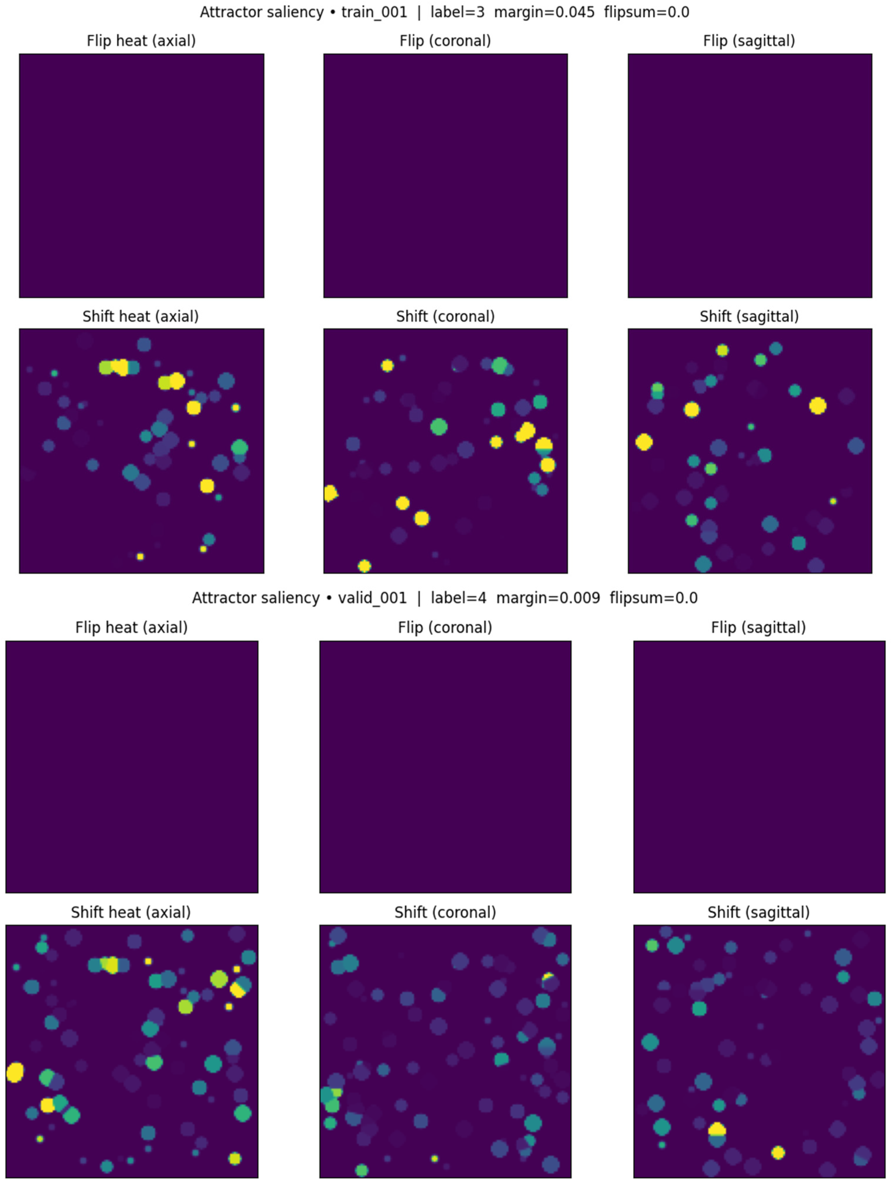 Figure 10). Benchmarking against Grad-CAM and integrated gradients showed minimal overlap (Dice ≈ 0.095) and near-zero overlap with simple enhancing region masks, underscoring that attractor-based mapping captures distinct, unsupervised morphodynamic sensitivity (