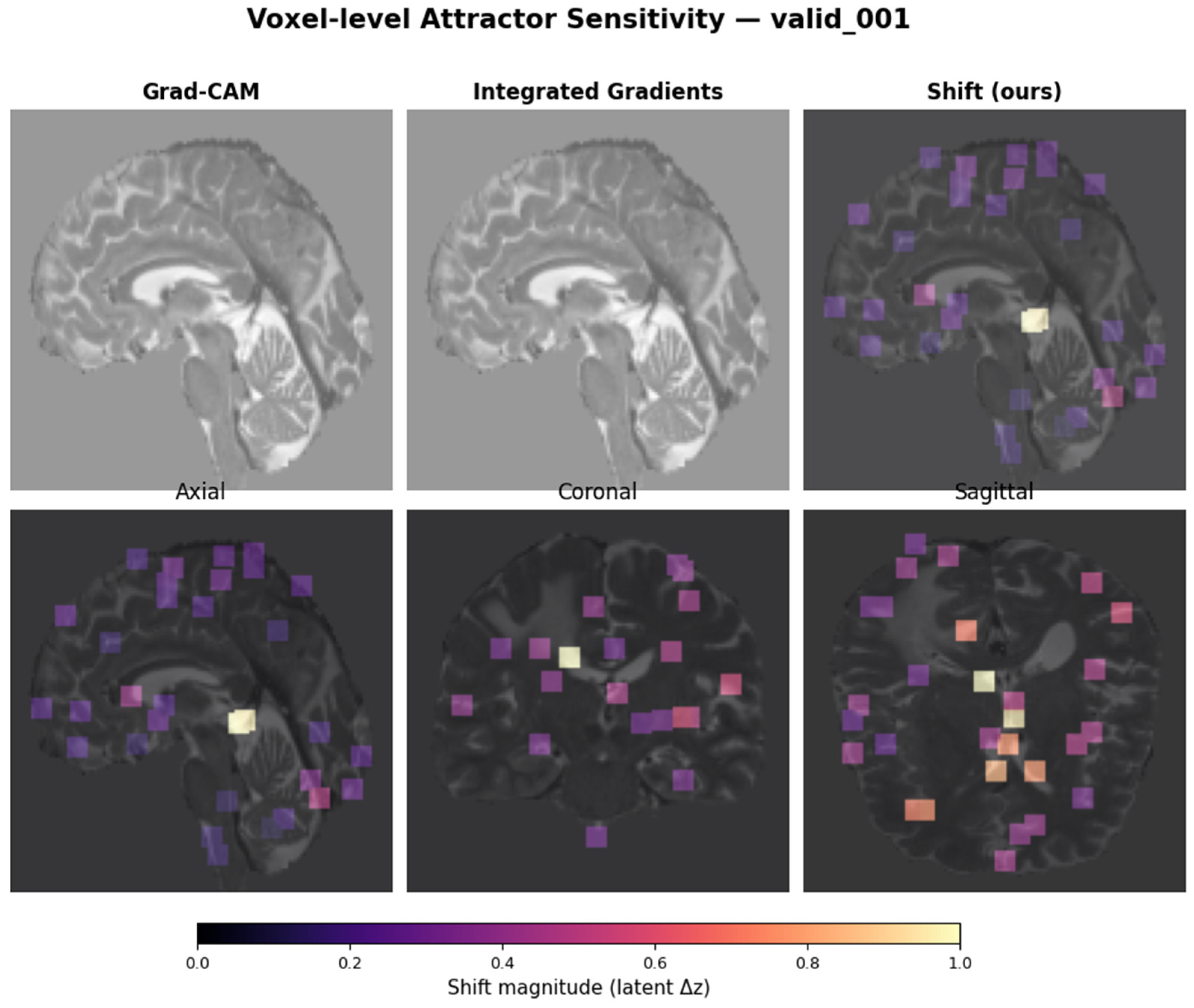 In contrast to previous interpretability approaches (e.g., gradient saliency, class activation maps, or counterfactuals), our method explicitly quantifies the local stability of the learned attractor landscape. We define attractor stability maps as voxel-wise fields describing how small, spatially localized perturbations in the input space affect the system’s attractor membership in latent space.