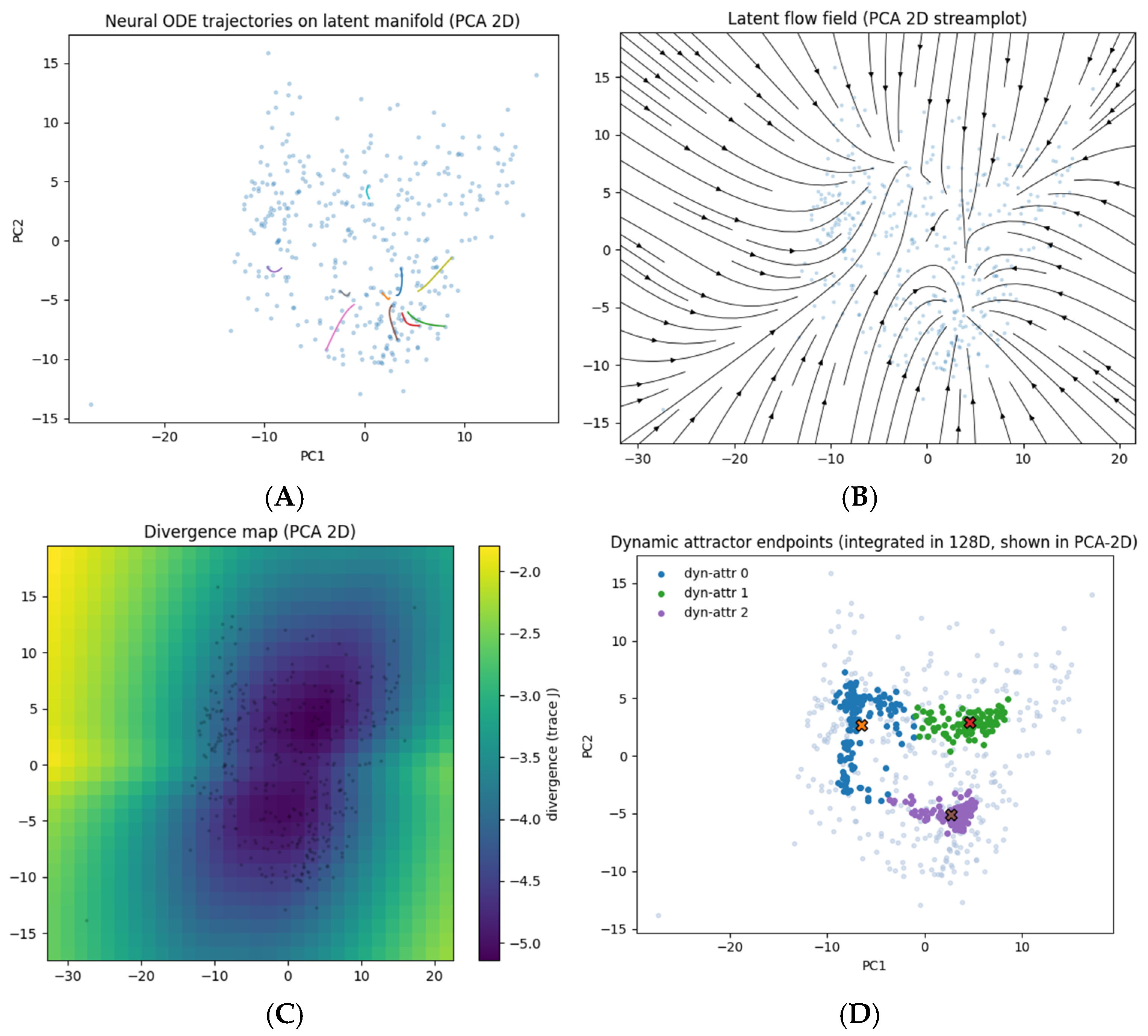 Figure 12D). Approximately 87 ± 4% of trajectories reached a stable region within 200 steps, suggesting that the field enforces organizing morphodynamic behavior. ODE training reused the same latent encodings and random seed 42 as the static analyses to ensure comparability.