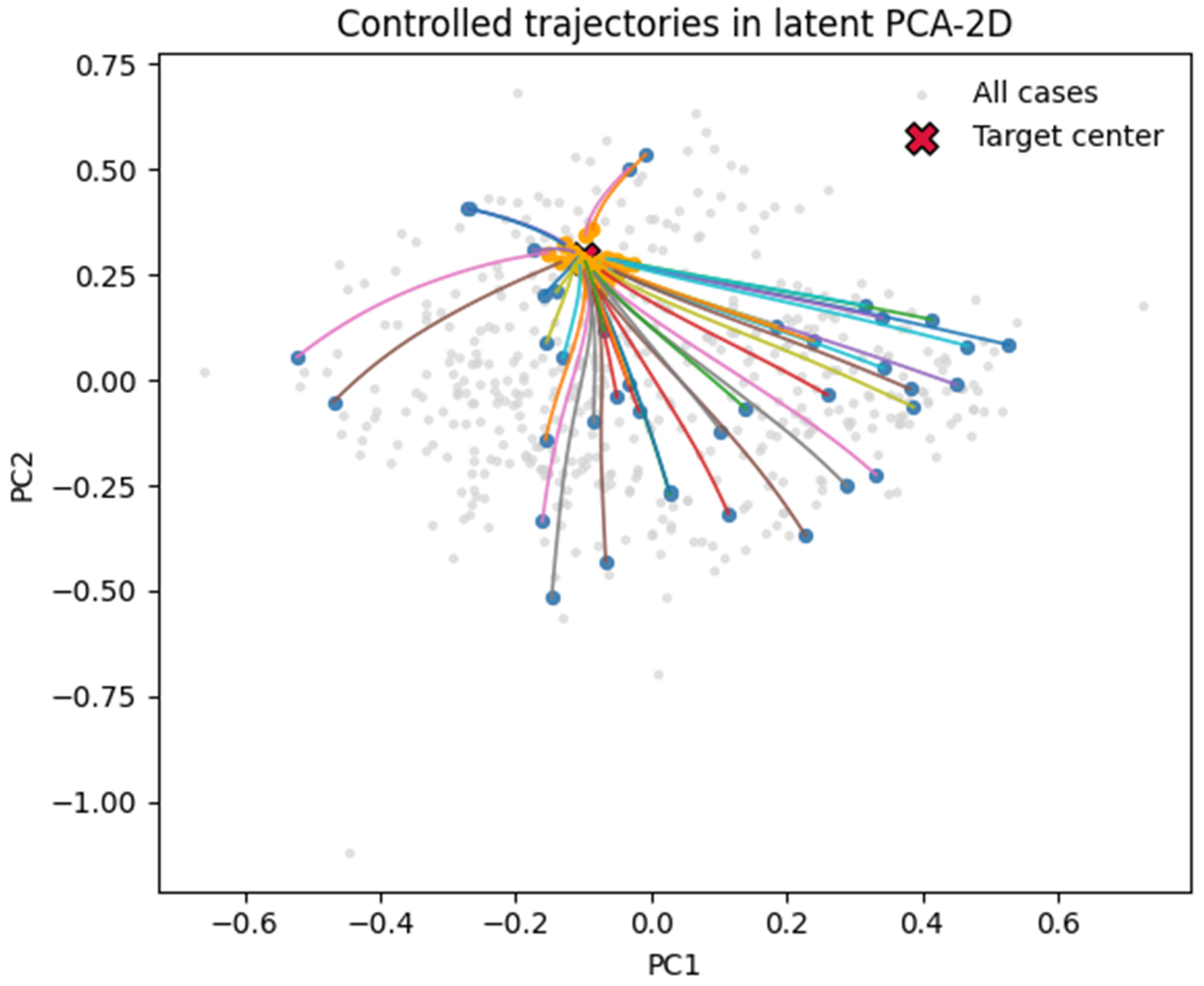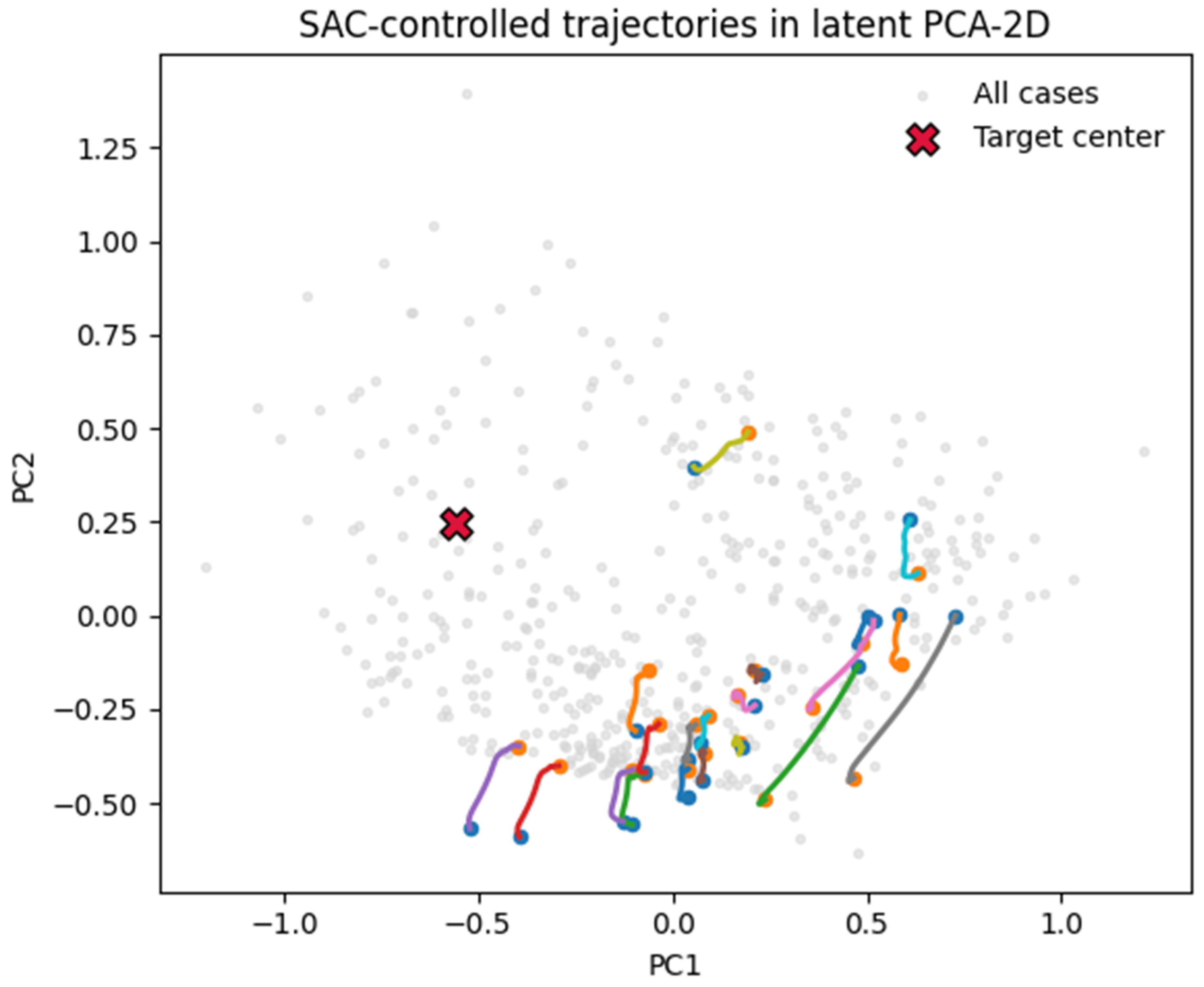 Proof-of-concept control simulations, implemented through deterministic and soft actor–critic (SAC) reinforcement learning controllers, further demonstrated that trajectories within the latent manifold can be computationally redirected toward lower-risk basins. This establishes a foundation for the in silico exploration of therapeutic modulation and adaptive intervention strategies.