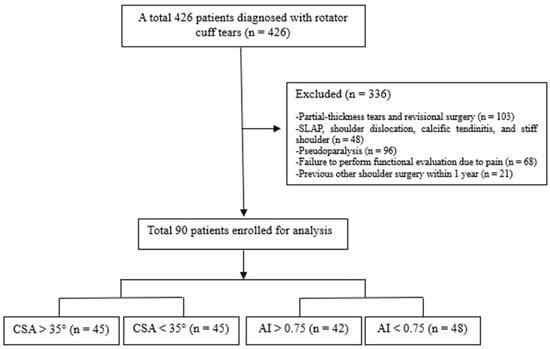 This study retrospectively analyzed prospectively collected data from 426 patients diagnosed with RCTs between 2015 and 2023. The inclusion criteria were as follows: (1) only full-thickness RCTs that preoperatively underwent all functional evaluations; (2) preoperative true anteroposterior (AP) radiographs to assess CSA and AI. The exclusion criteria were as follows: (1) partial-thickness tears and revision surgery; (2) other lesions, such as superior labrum from anterior to posterior, shoulder dislocation, calcific tendinitis, and stiff shoulder; (3) pseudoparalysis; (4) failure to perform functional evaluation due to pain; and (5) previous shoulder surgery within 1 year, such as due to fractures. In the present study, high CSA and AI were defined as CSA > 35° [18] and AI > 0.75 [6,19]. Of the 426 patients, 336 were excluded; thus, the final assessment used data from 90 patients (45 with high preoperative CSA vs. 45 with low preoperative CSA, and 42 with high preoperative AI vs. 48 with low preoperative AI) (Figure 1). The CSA and AI groupings overlap (the same patients may be included in both comparisons). Among the 90 patients, 26 (28.9%), 50 (55.5%), and 14 (15.6%) had small, medium, and large tears, respectively. The tear size of the rotator cuff muscles was classified as small (<1 cm), medium-sized (1–3 cm), or large to massive (>3 cm). Furthermore, 41 (45.6%) patients had subscapularis tears, which were classified using the Yoo and Rhee classification [20]. Fatty infiltration was confirmed using the Goutallier classification [21]. All patients simultaneously underwent imaging and functional assessment during outpatient visits.