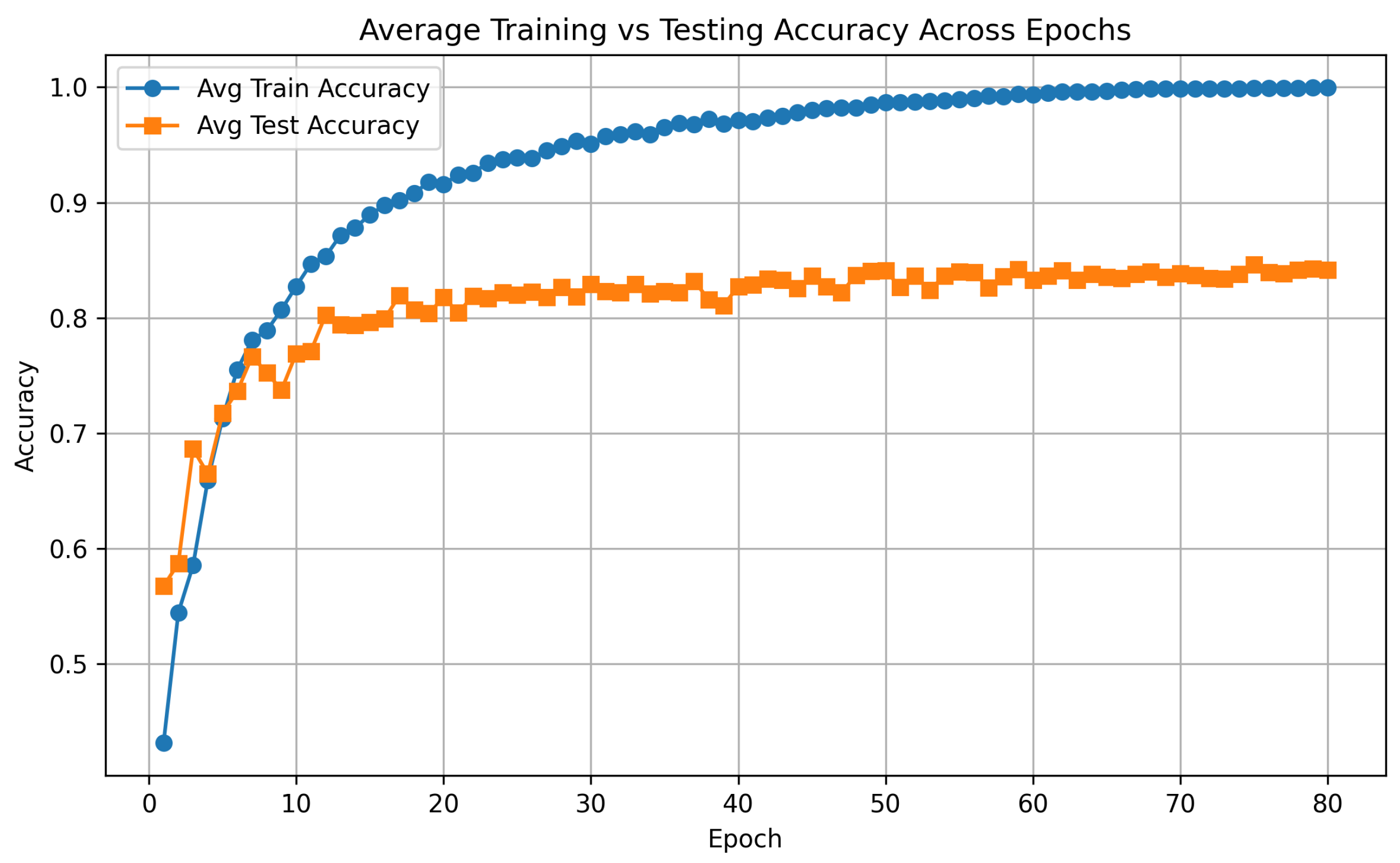 Training and testing accuracy averaged over all subjects per-epoch across 80 epochs.