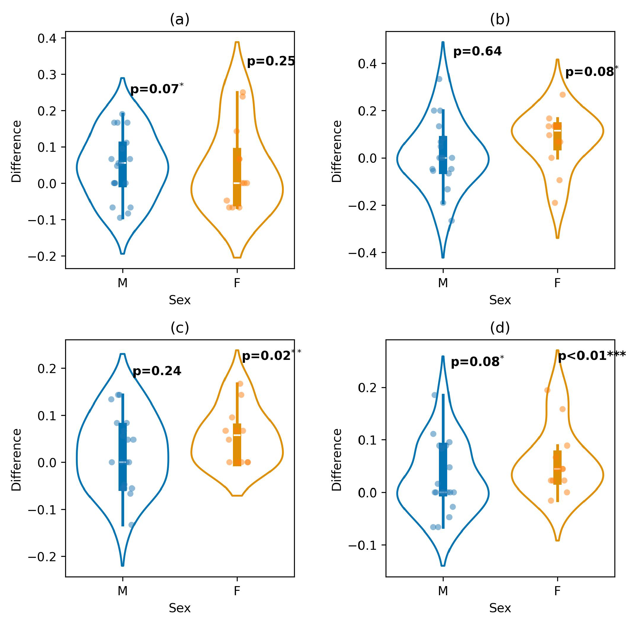 Performance difference between the extended and baseline models across sex groups for predicting: (a) negative, (b) neutral, (c) positive, and (d) overall emotions (* p-value < 0.1; ** p-value < 0.05; *** p-value < 0.01).