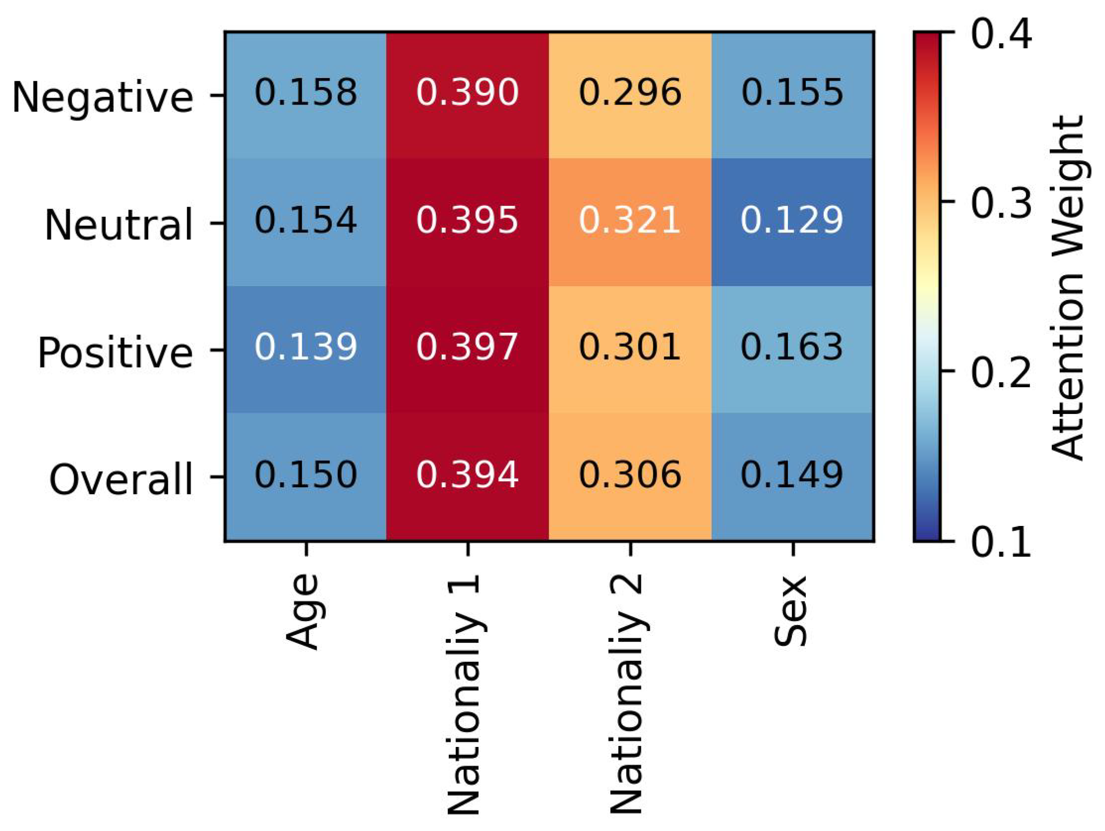 Average attention weights (scaled by ) assigned to the four demographic variables across emotion categories. Higher values (red tones) indicate greater relative importance of the demographic feature in emotion prediction.