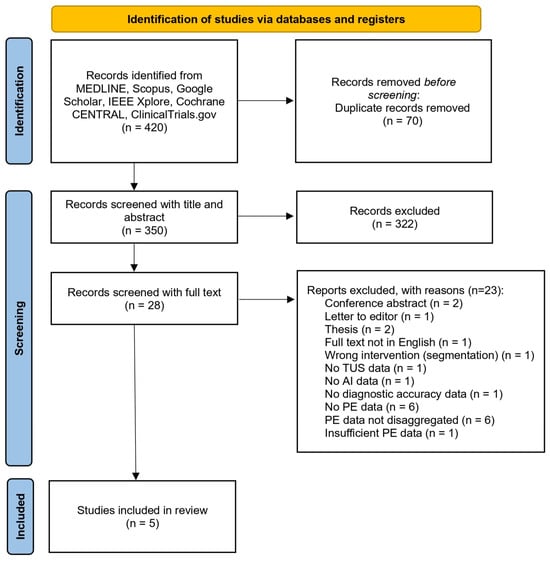 This systematic review was registered with PROSPERO (CRD420251128416) and conducted in accordance with the Preferred Reporting Items for Systematic Reviews and Meta-Analyses (PRISMA) guidelines [75,76]. The study aimed to evaluate the diagnostic accuracy of AI-based automated analysis applied to TUS for the detection of PE.