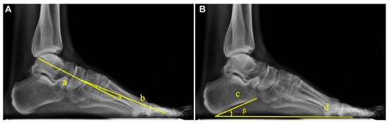 The Meary angle was measured as the angle between the longitudinal axis of the talus and the longitudinal axis of the first metatarsal, with a normal range of 0° ± 4° [11,18]. The Pitch angle was defined as the angle between the inferior border of the calcaneus and the horizontal line, with a normal range of 20–30°. The measurements are exemplified in Figure 1.