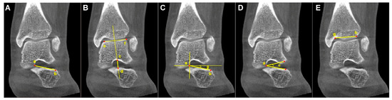 The following parameters were measured: sinus tarsi length (STL), sinus tarsi width (STW), the angle between the long axis of the sinus tarsi and the horizontal line (ST-H angle), the sinus tarsi angle (ST angle), and tibia width. The ratios of STL to tibia width (STL/tibia width) and STW to tibia width (STW/tibia width) were subsequently calculated. The measured parameters were defined as the following and are marked in Figure 3: