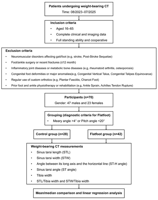 This single-center retrospective study analyzed WBCT images of patients who underwent ankle WBCT examinations at our institution from August 2023 to July 2025. All WBCT scans were performed using a dedicated WBCT system (Planmed Oy, Helsinki, Finland). The scanning parameters were set as follows: (1) original slice thickness: 0.4 mm, (2) isotropic voxel resolution: 0.4 mm, (3) tube voltage: 96 kVp, and (4) tube current: 10 mA. During the scan, patients assumed a natural single-leg standing position under full WB conditions, ensuring stability and complete plantar load distribution throughout the procedure. The raw imaging data were exported in DICOM format. All DICOM images were imported into Mimics software (version 21.0; Materialise NV, Leuven, Belgium) for annotation of key anatomical landmarks and quantitative measurements, including the length, width, and angle of the sinus tarsi, as well as other evaluated parameters. All image data were sourced from the hospital’s Picture Archiving and Communication System (PACS) and were anonymized prior to analysis by removing identifiable personal information, such as name, contact details, and medical record number.