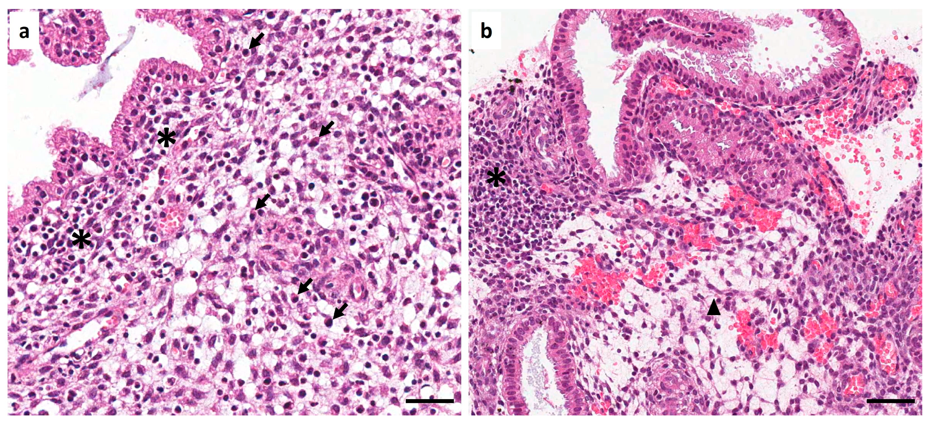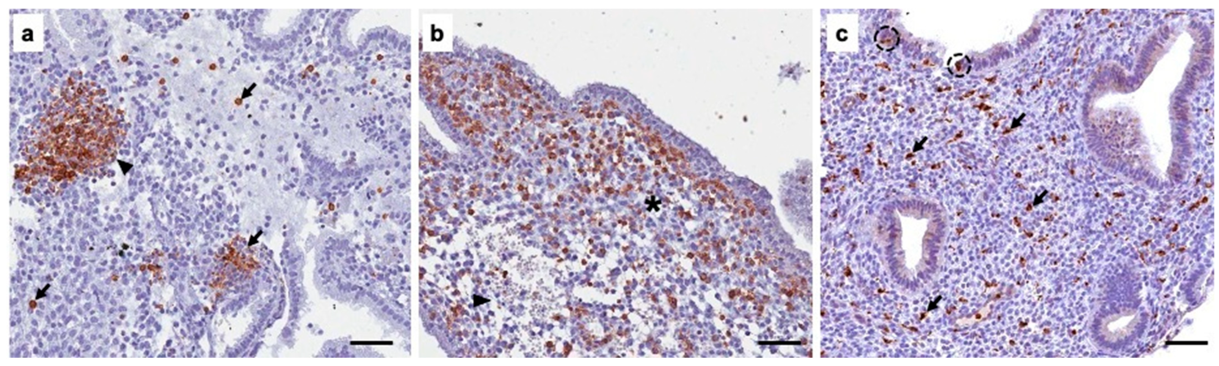- Reighard, S.D.; Sweet, R.L.; Vicetti Miguel, C.; Vicetti Miguel, R.D.; Chivukula, M.; Krishnamurti, U.; Cherpes, T.L. Endometrial leukocyte subpopulations associated with Chlamydia trachomatis, Neisseria gonorrhoeae, and Trichomonas vaginalis genital tract infection. Am. J. Obstet. Gynecol. 2011, 205, 324.e1–324.e7. [Google Scholar] [CrossRef] [PubMed]