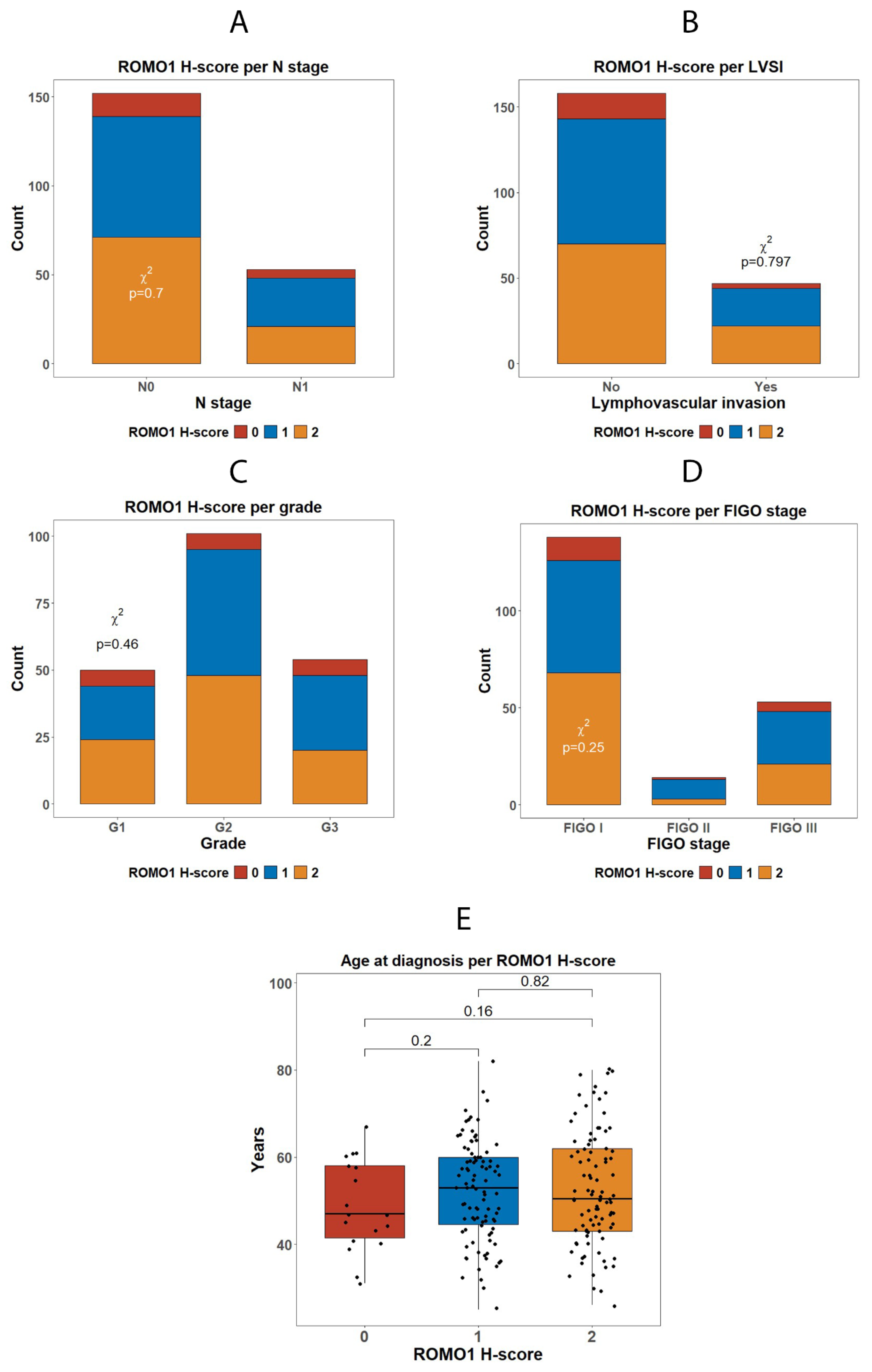 3.2. ROMO1 Expression and Clinicopathologic Features in Invasive Carcinoma