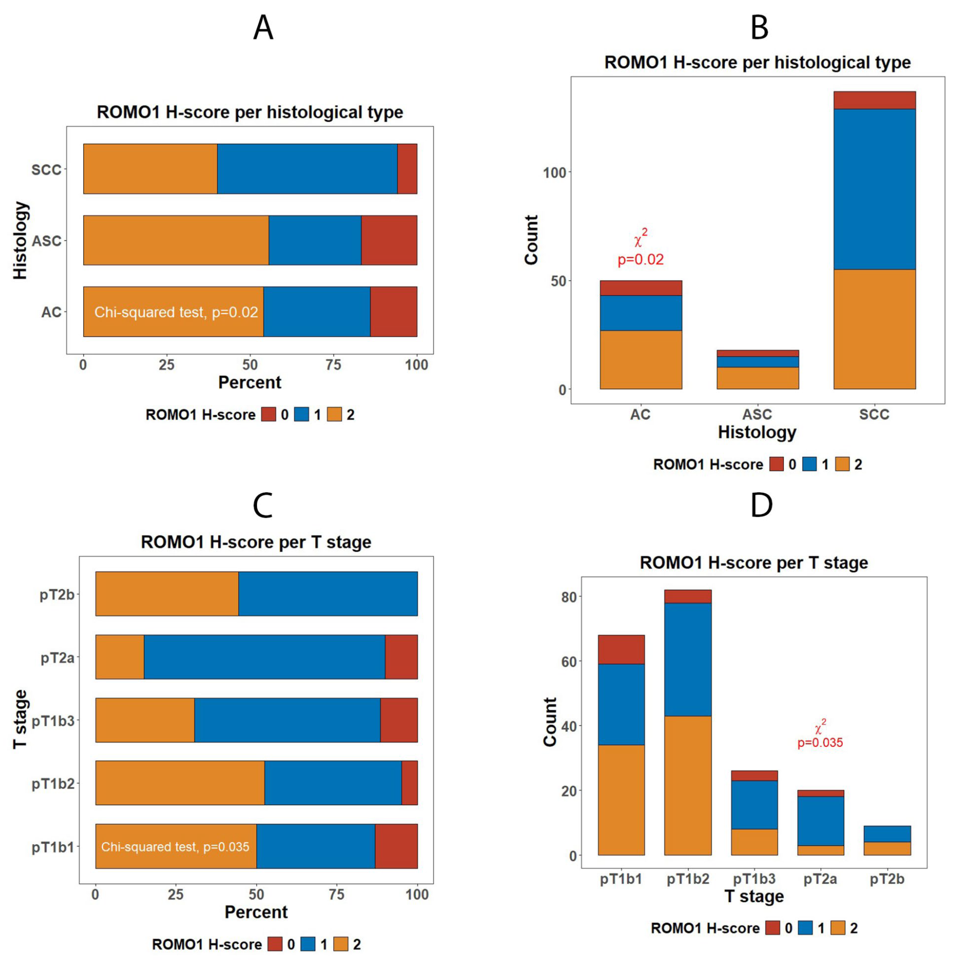 - ROMO1 expression differed significantly between histologic subtypes, with SCC showing higher expression than AC and ASC (p = 0.02). High ROMO1 immunoreactivity was most frequent in SCC, followed by ASC, and lowest in AC.