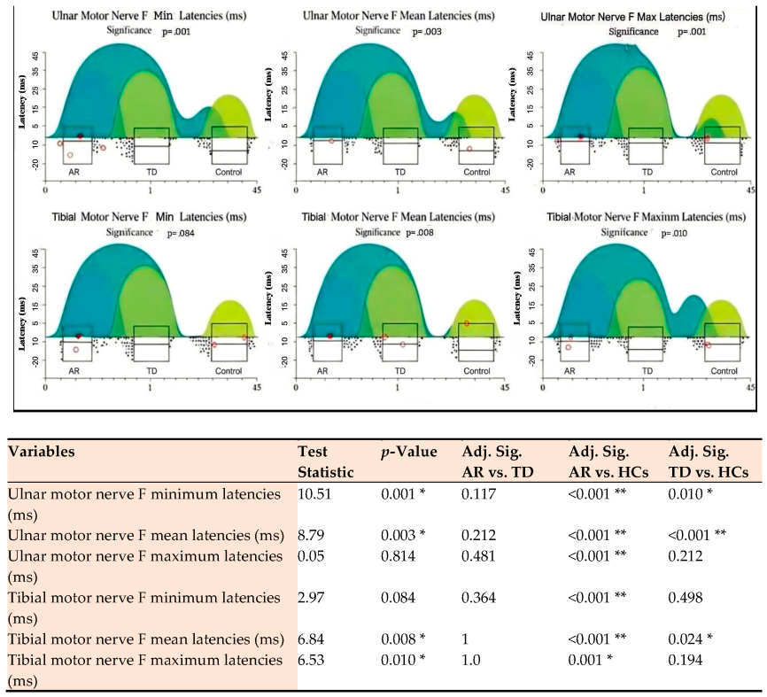 | Tibial Motor Nerve F Chronodispersion | 3.8 (1.1–24.7) | 4.0 (0.5–16.9) | 2.3 (0.8–13.6) | 3.10 | 0.077 |
