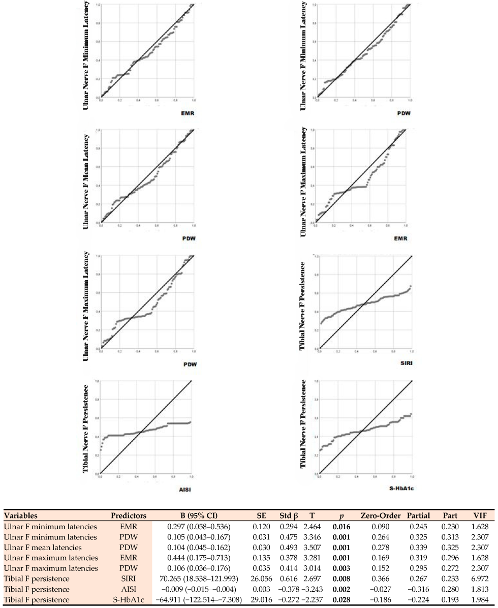 3.5. Multiple Linear Regression Analysis of F-Wave Parameters for Clinical and Biochemical Predictors