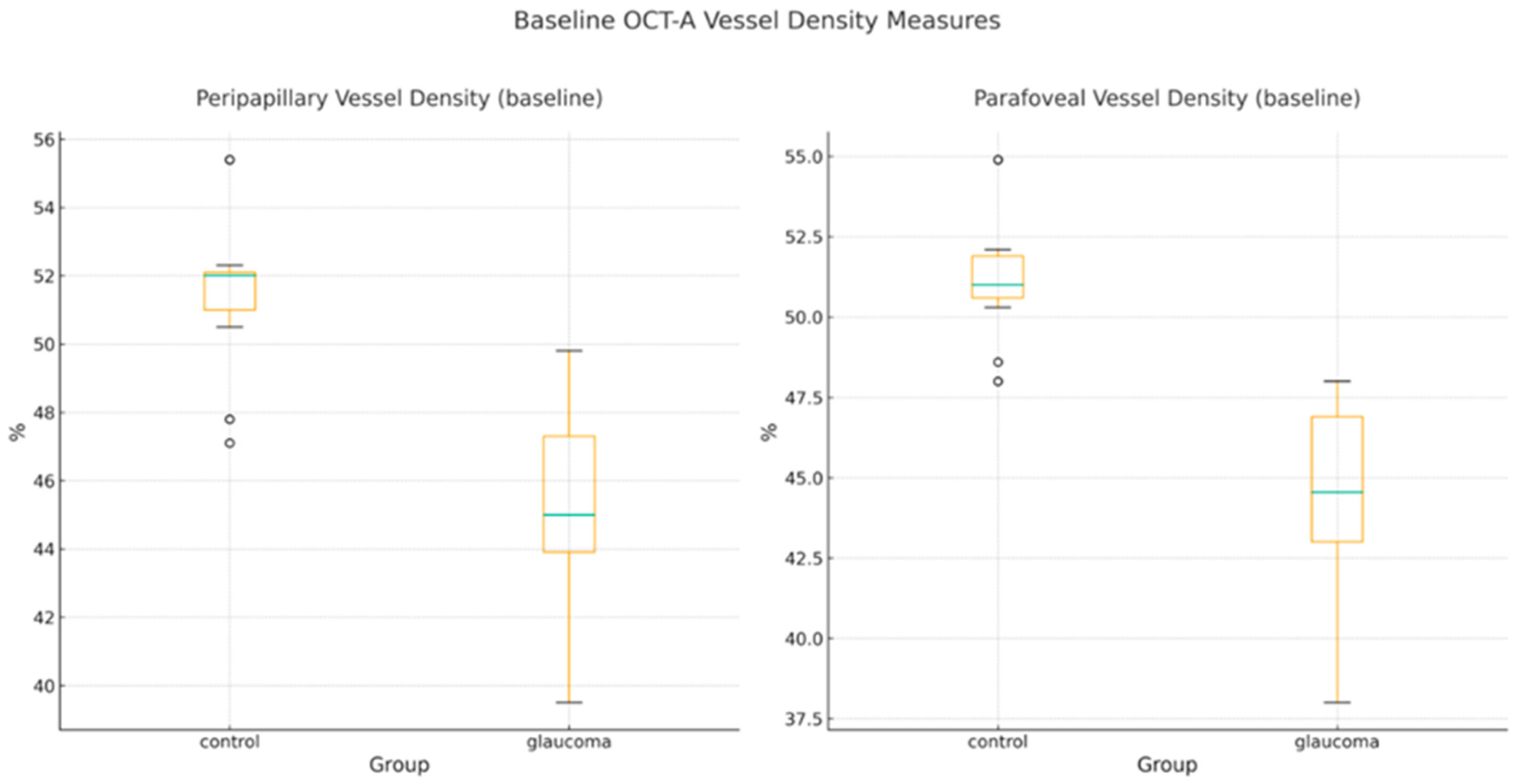- Miguel, A.; Silva, A.; Barbosa-Breda, J.; Azevedo, L.; Abdulrahman, A.; Hereth, E.; Abegão Pinto, L.; Lachkar, Y.; Stalmans, I. OCT-angiography detects longitudinal microvascular changes in glaucoma: A systematic review. Br. J. Ophthalmol. 2022, 106, 667–675. [Google Scholar] [CrossRef] [PubMed]